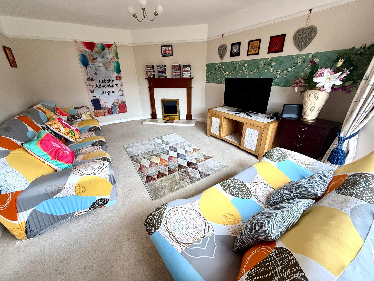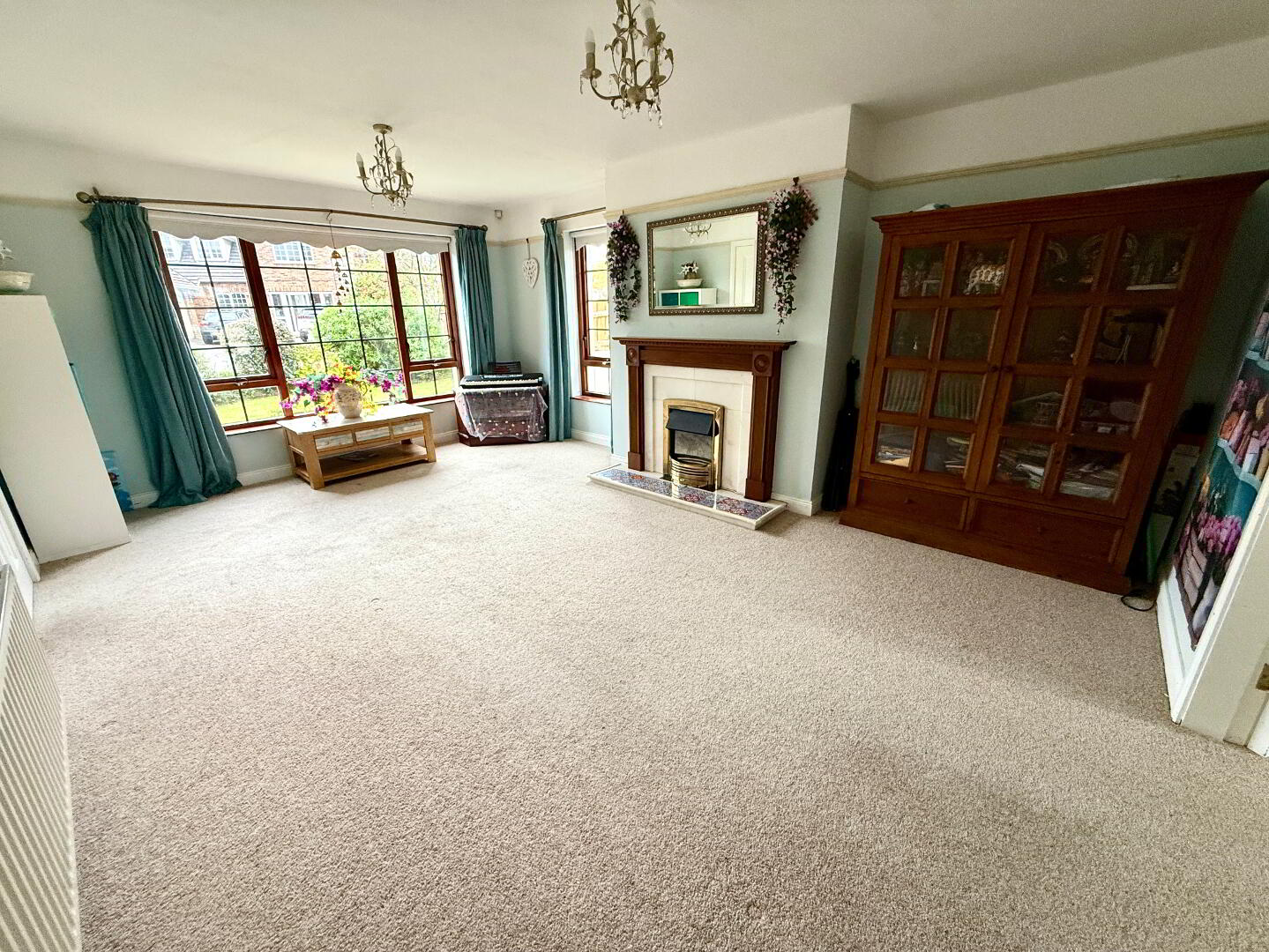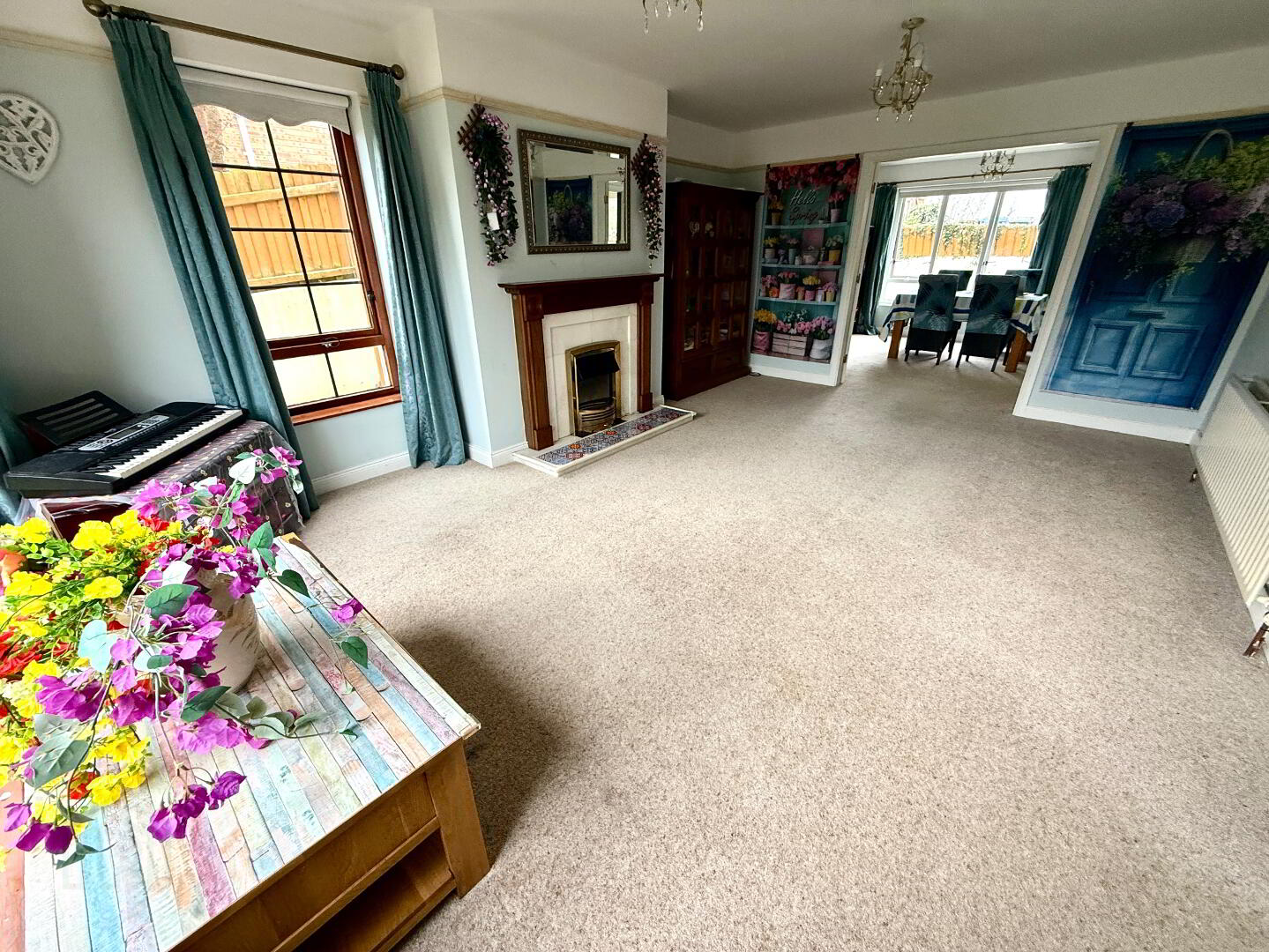 Lounge 18'1 x 13' (to widest points) Dual aspects, marble fireplace and hearth with wooden surround, picture rail, double doors to dining room, wall light.