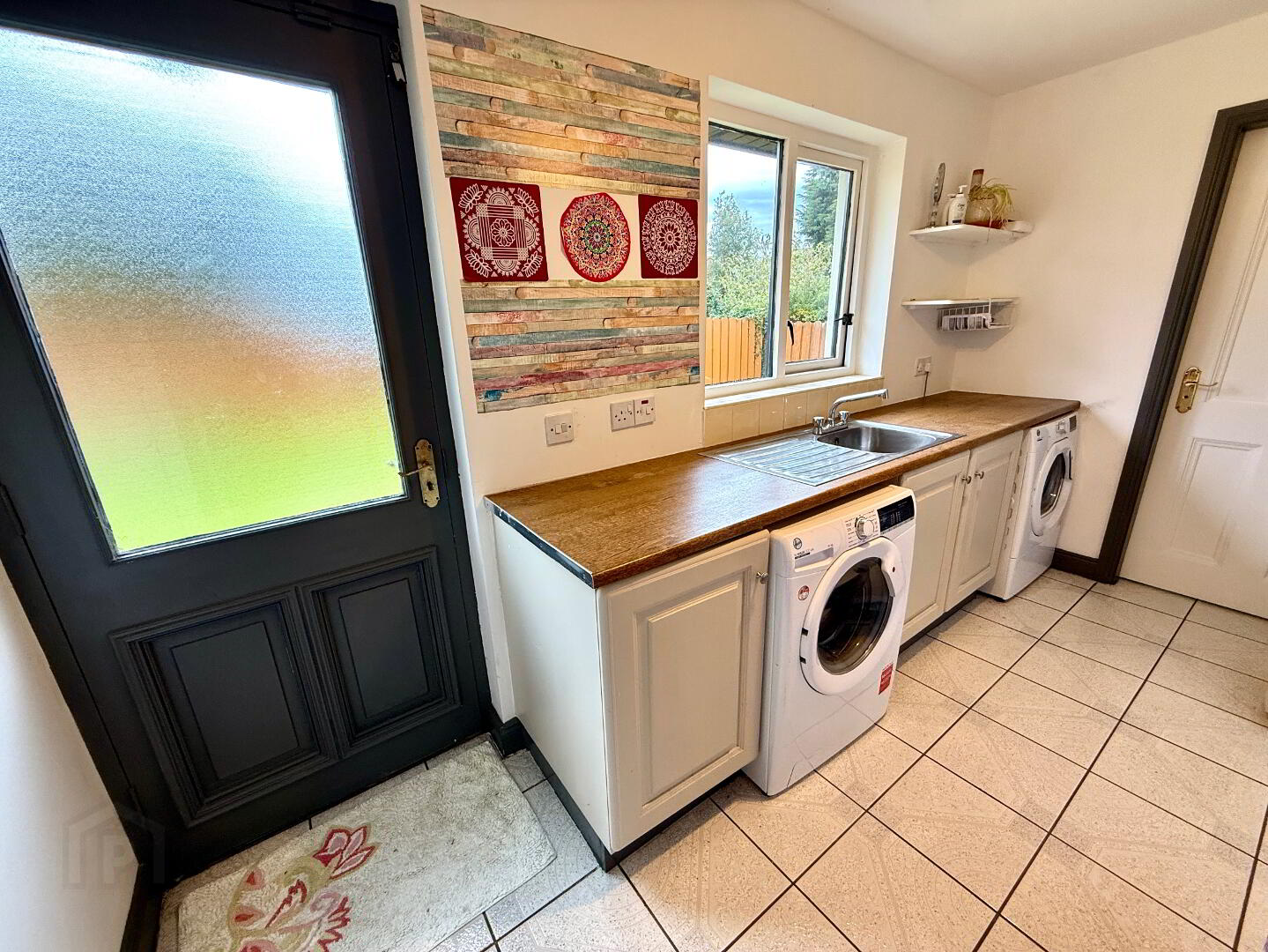 Utility Room 12'4 x 6'1 Single drainer stainless steel sink unit with mixer tap, plumbed for washing machine, space for tumble dryer, open display shelves, partly tiled walls, tiled floor.