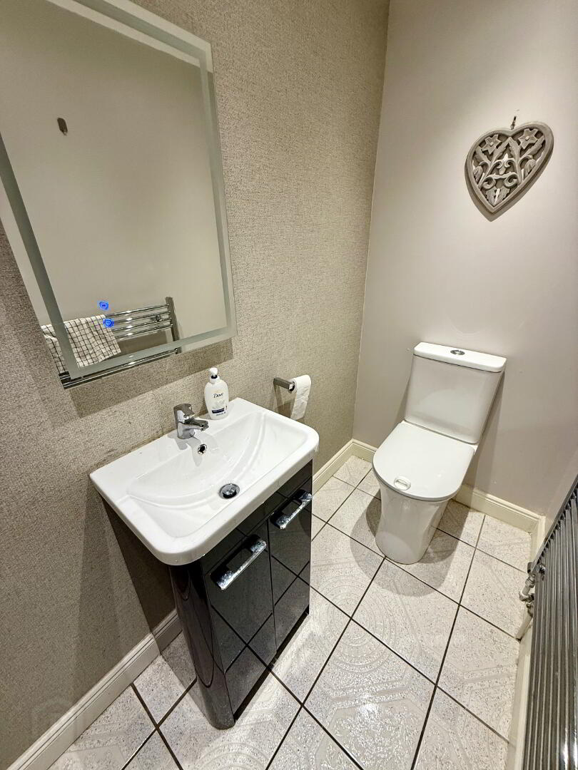 Downstairs WC WC and wash hand basin set in vanity unit, tiled floor, recessed lighting.