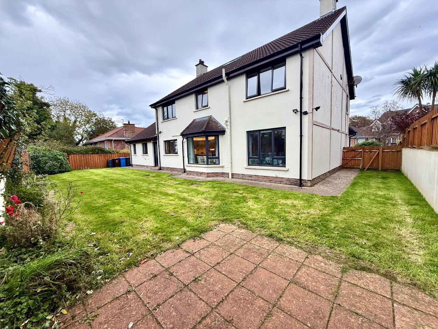 Garden to rear laid lawn enclose by fence enhanced with flower border.