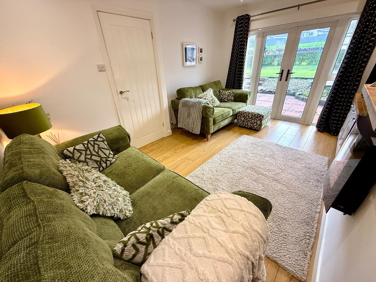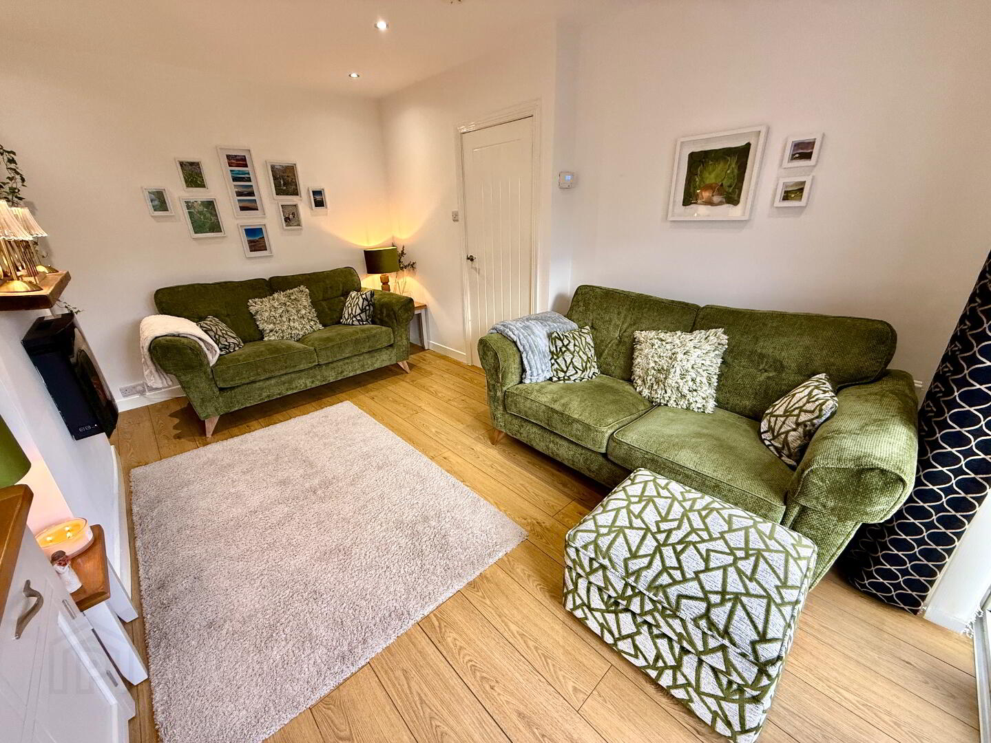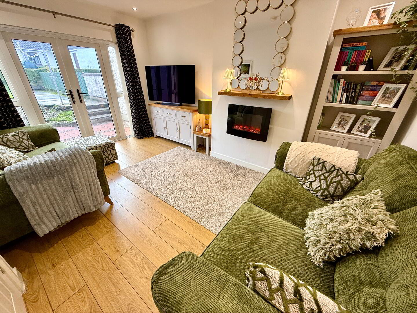 Lounge Wall mounted electric fire, laminated wooden floor, double patio doors, recessed lighting.