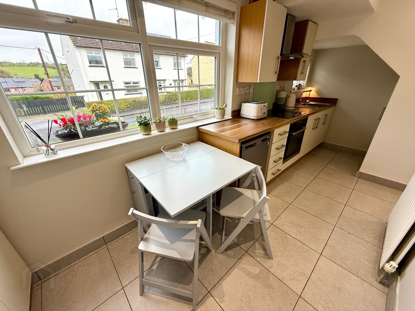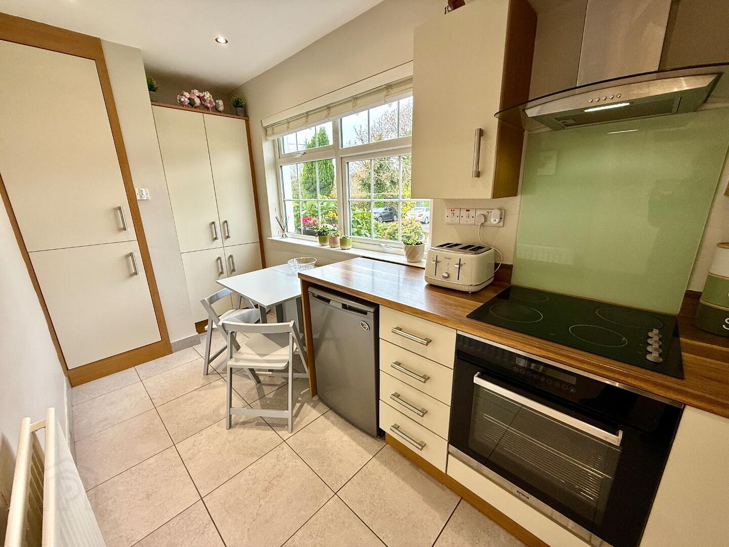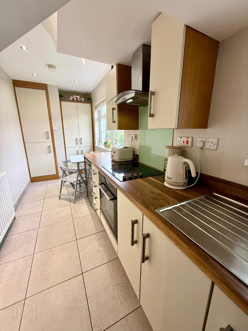 Kitchen/Dining Eye and low level units, single drainer stainless steel sink unit with mixer tap, hob, oven and extractor fan, larder cupboard, understair storage, tiled floor, recessed lighting.