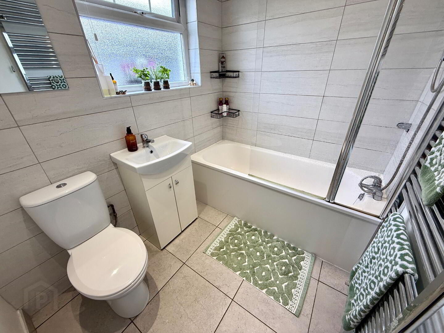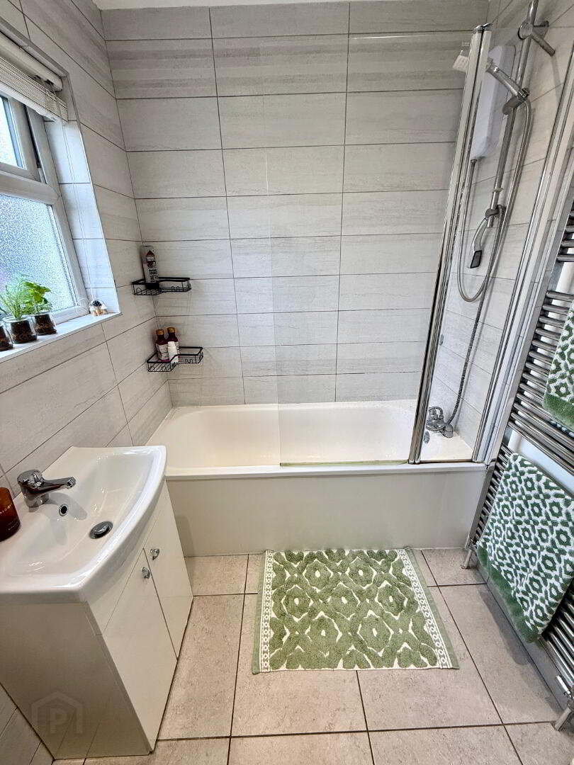 Bathroom Bath with electric shower overhead, wash hand basin set in vanity unit, heated towel rail, partly tiled walls, tiled floor, recessed lighting.