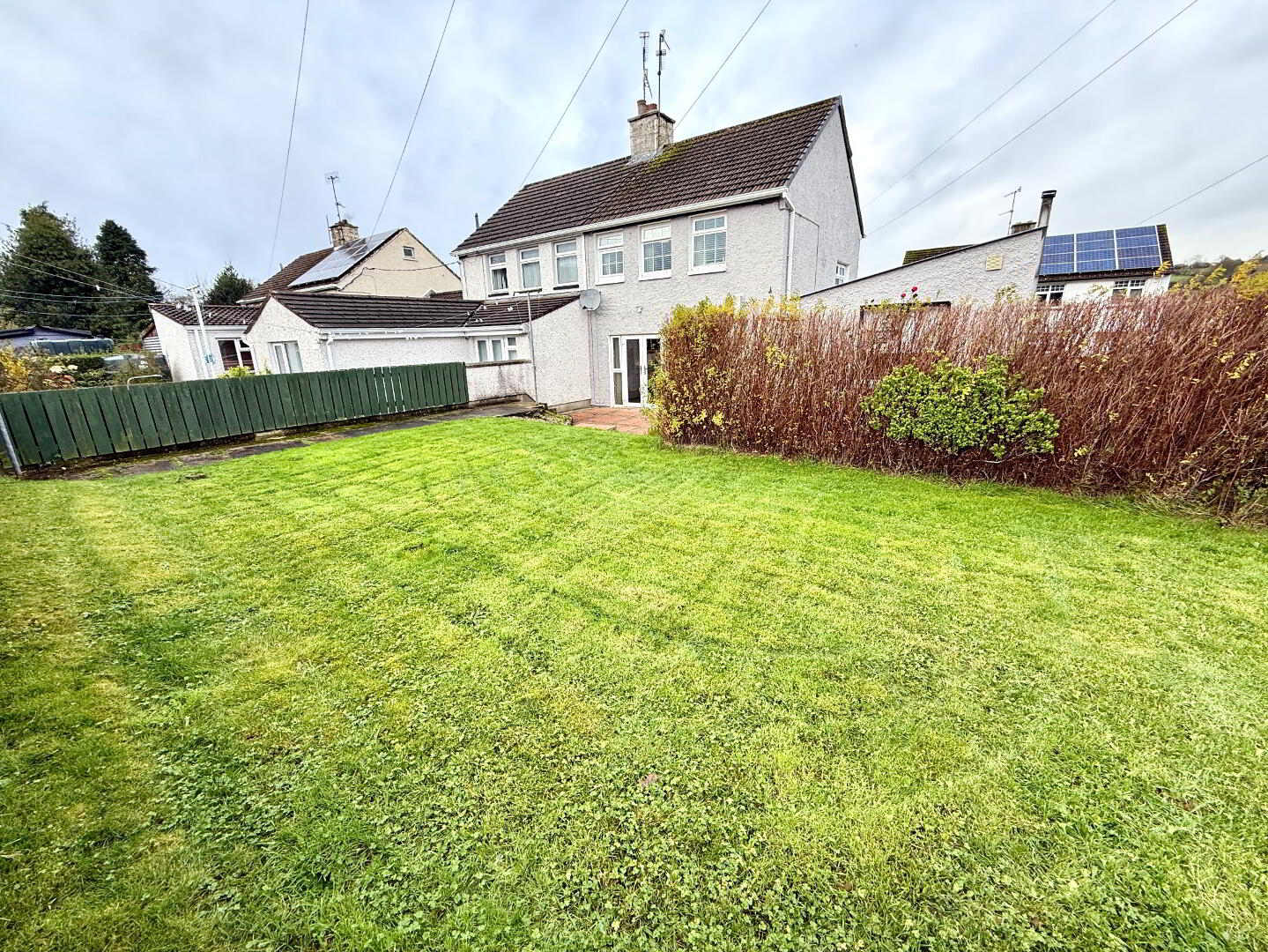 Garden to rear laid in lawn enclosed by fence and maturing hedge.