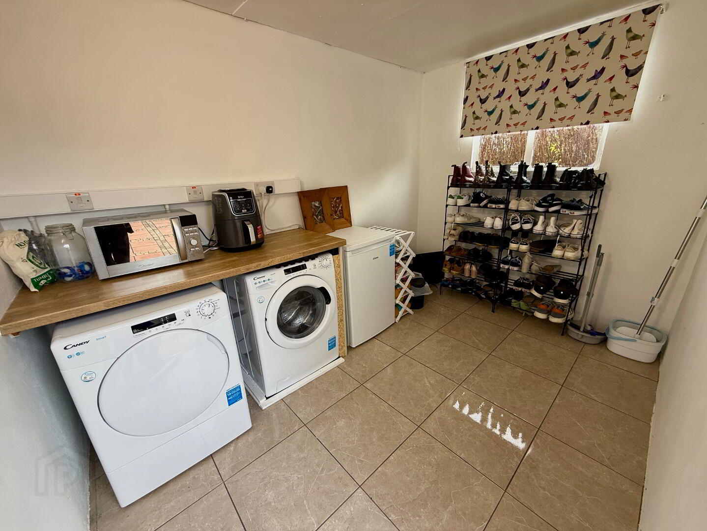 Utility Area Plumbed for washing machine, space for tumble dryer, tiled floor.