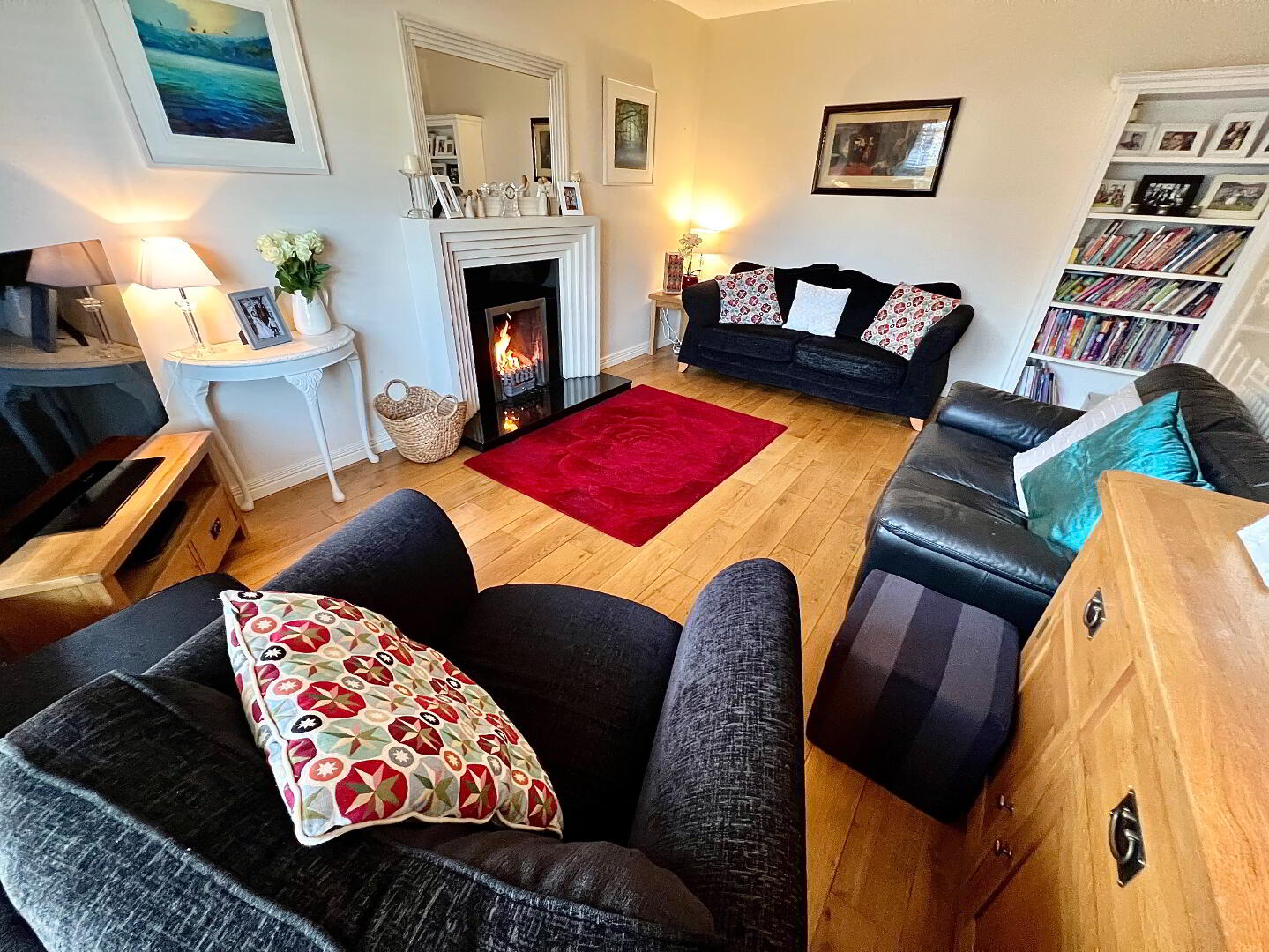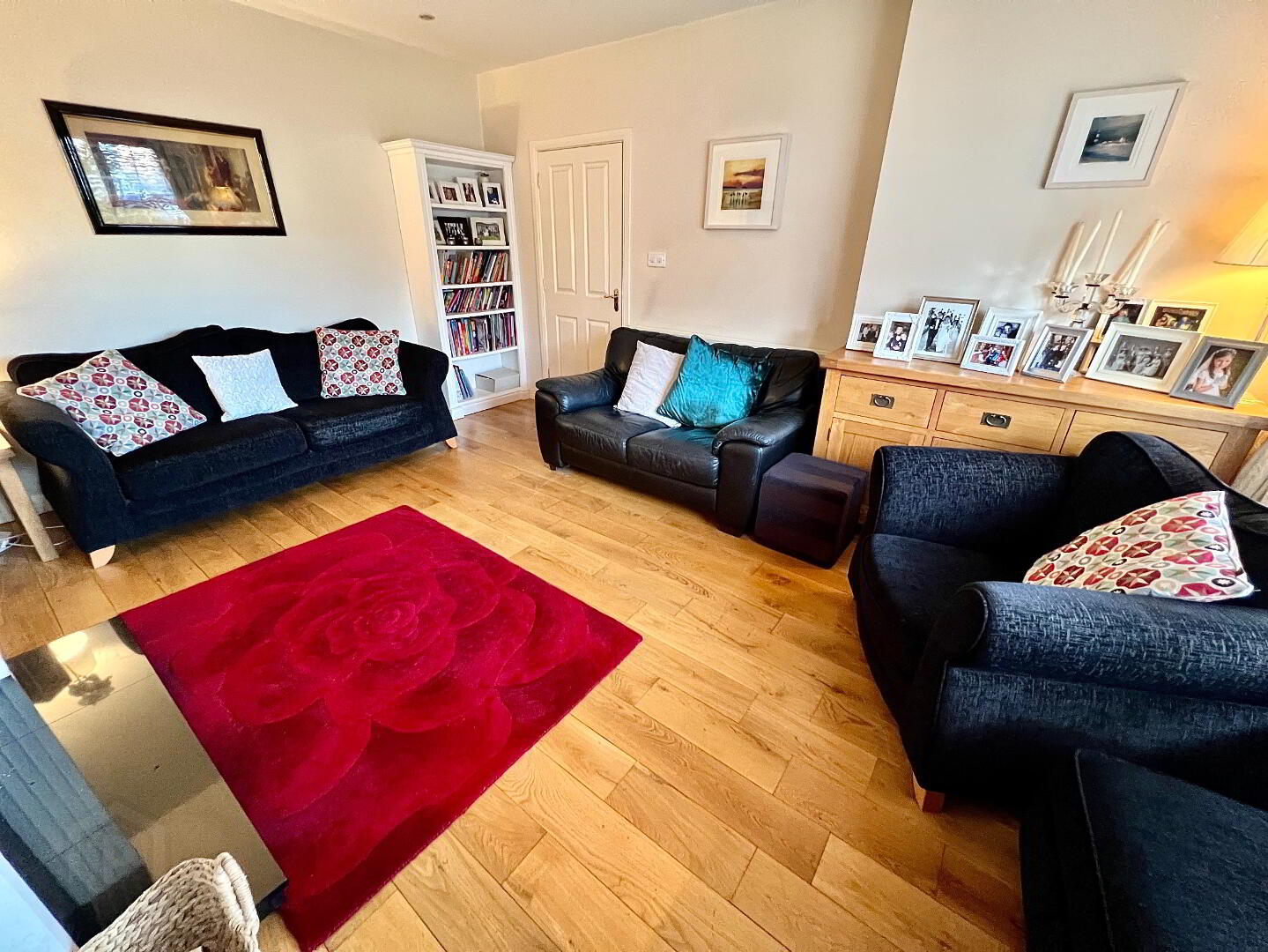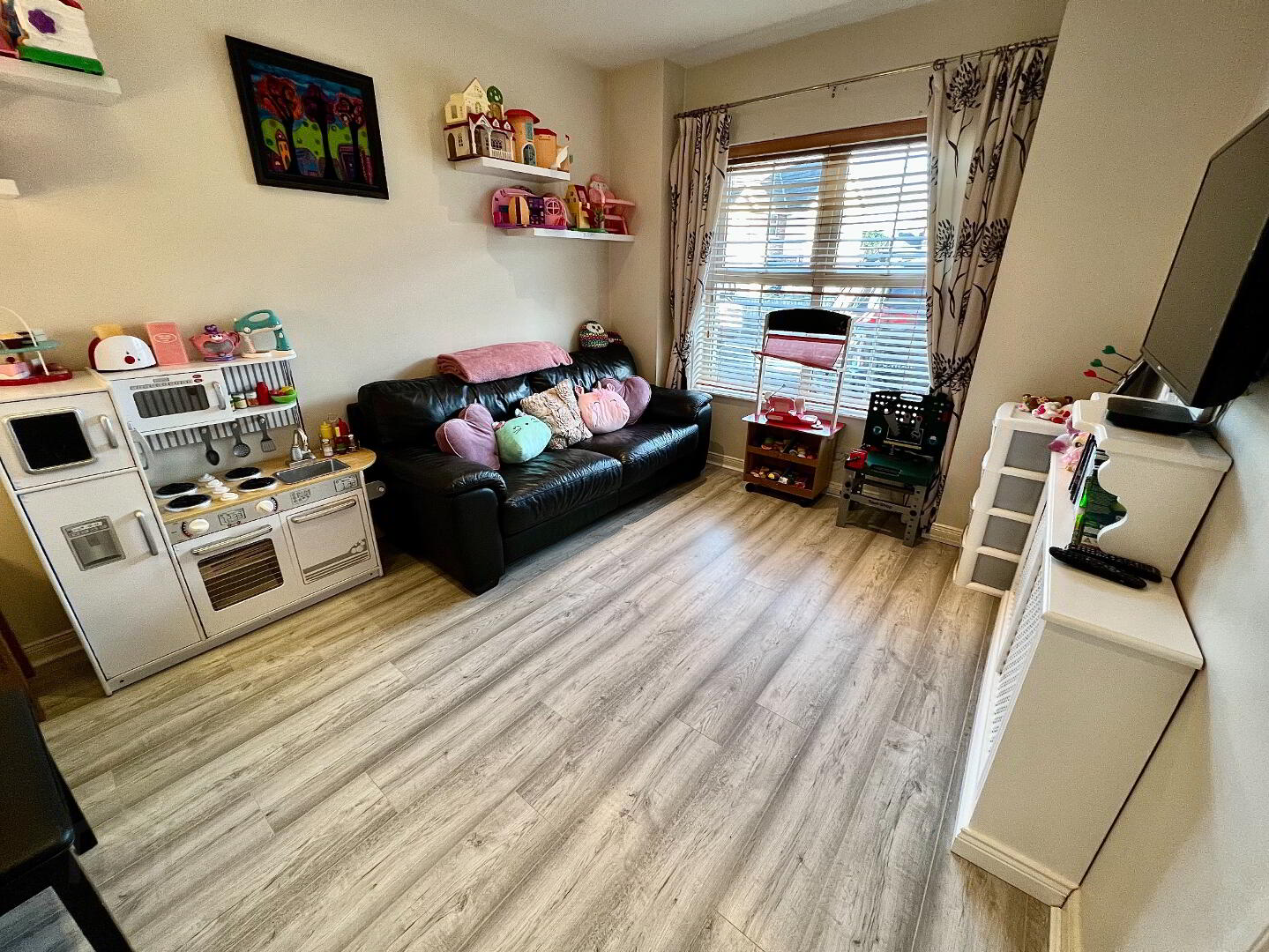 Family Room 12'10 x 9'9 (to widest points) Laminated wooden floor, radiator cover, recessed lighting