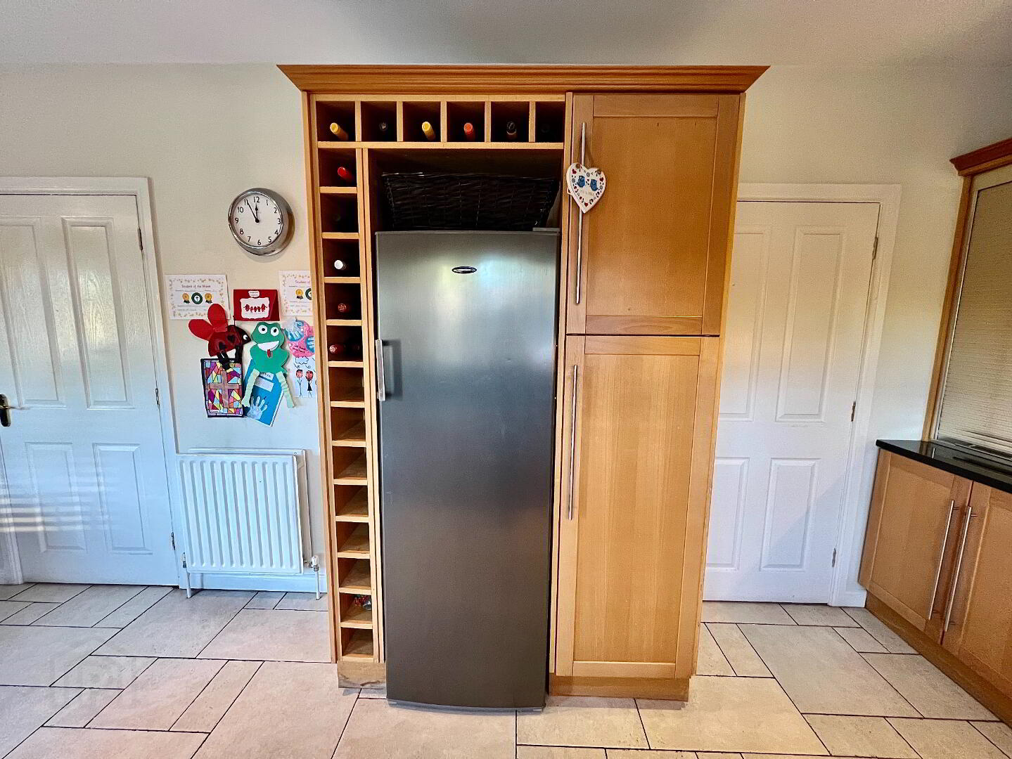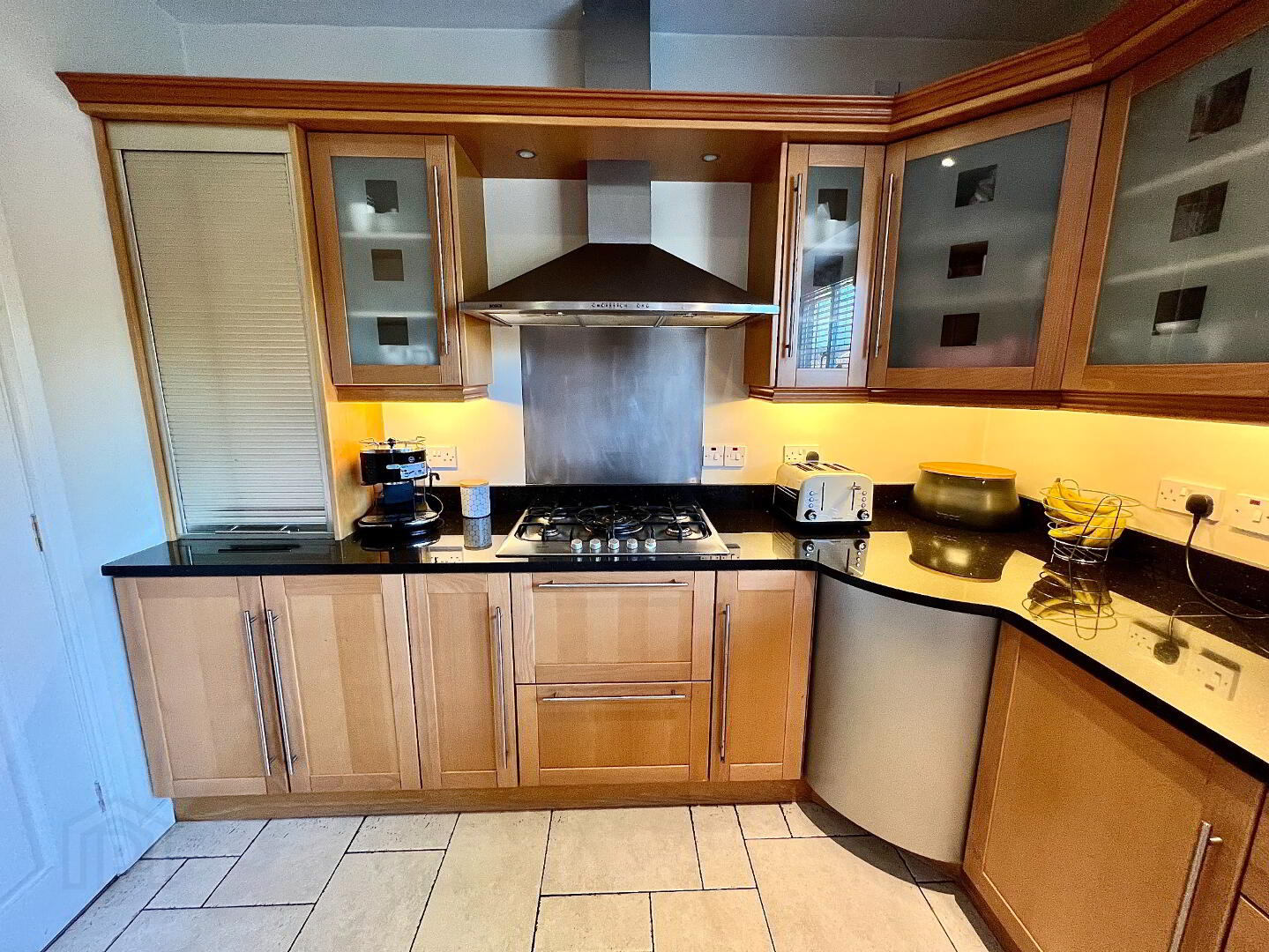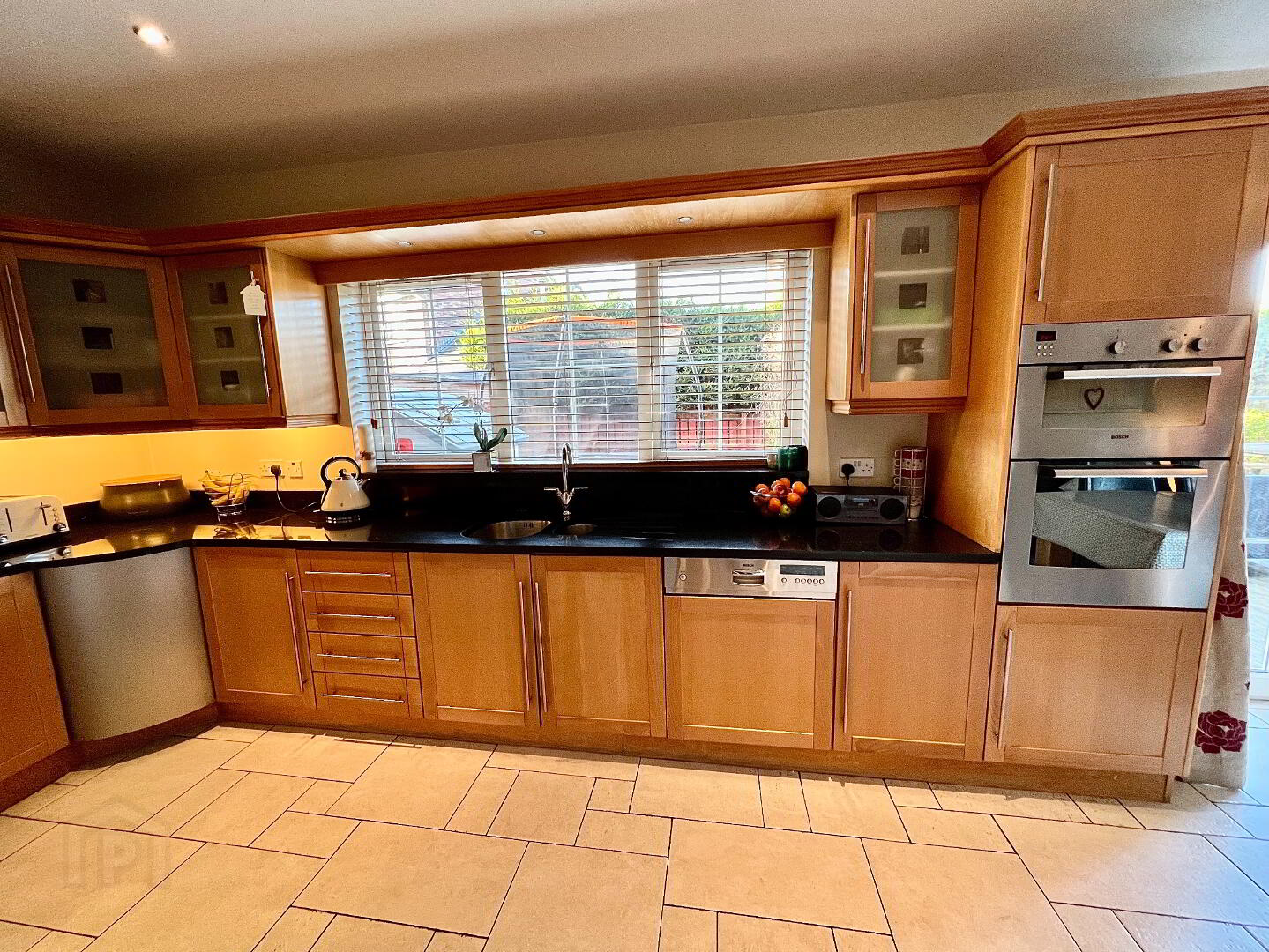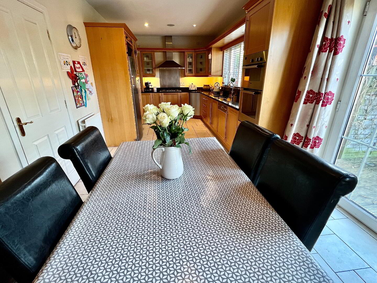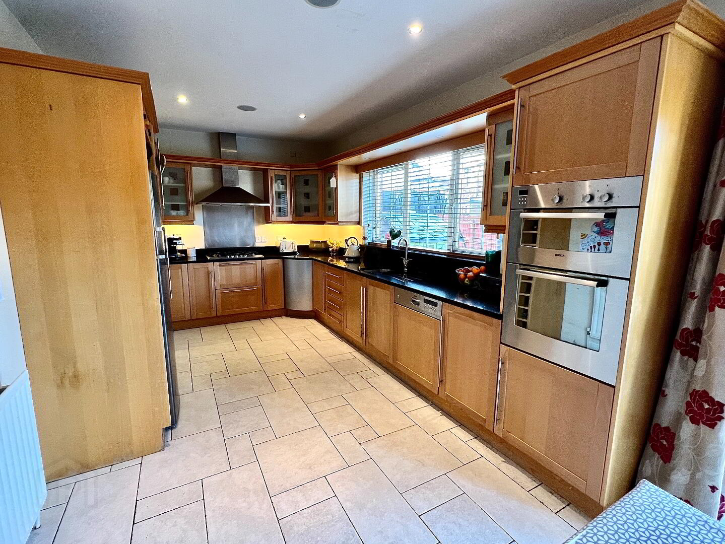 Kitchen/Dining 22'8 x 11'6 Eye and low level units, 1 1/2 bowl stainless steel sink unit with mixer taps, hob, double wall oven, extractor fan, glazed display units, wine rack, walk in larder, granite worktop, tiled floor