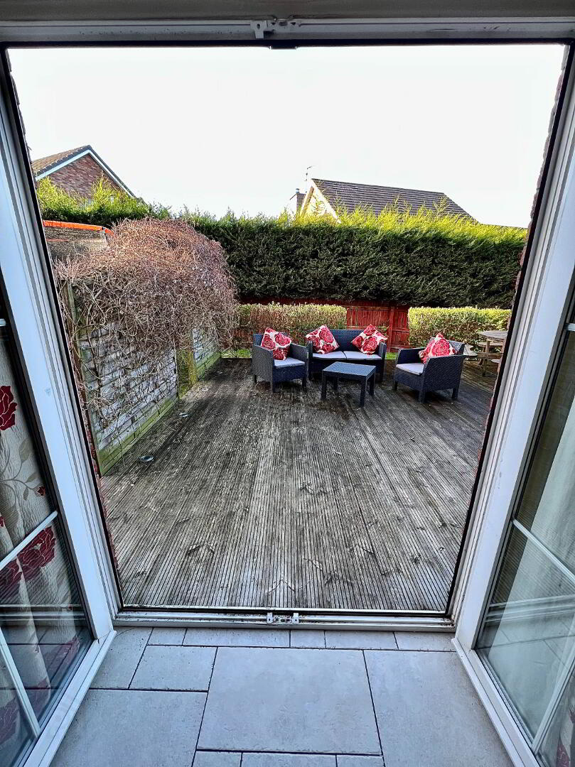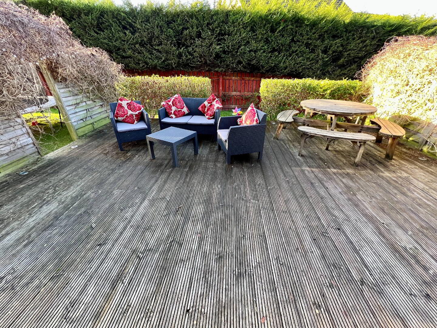 Decked area enclosed by fence and hedging