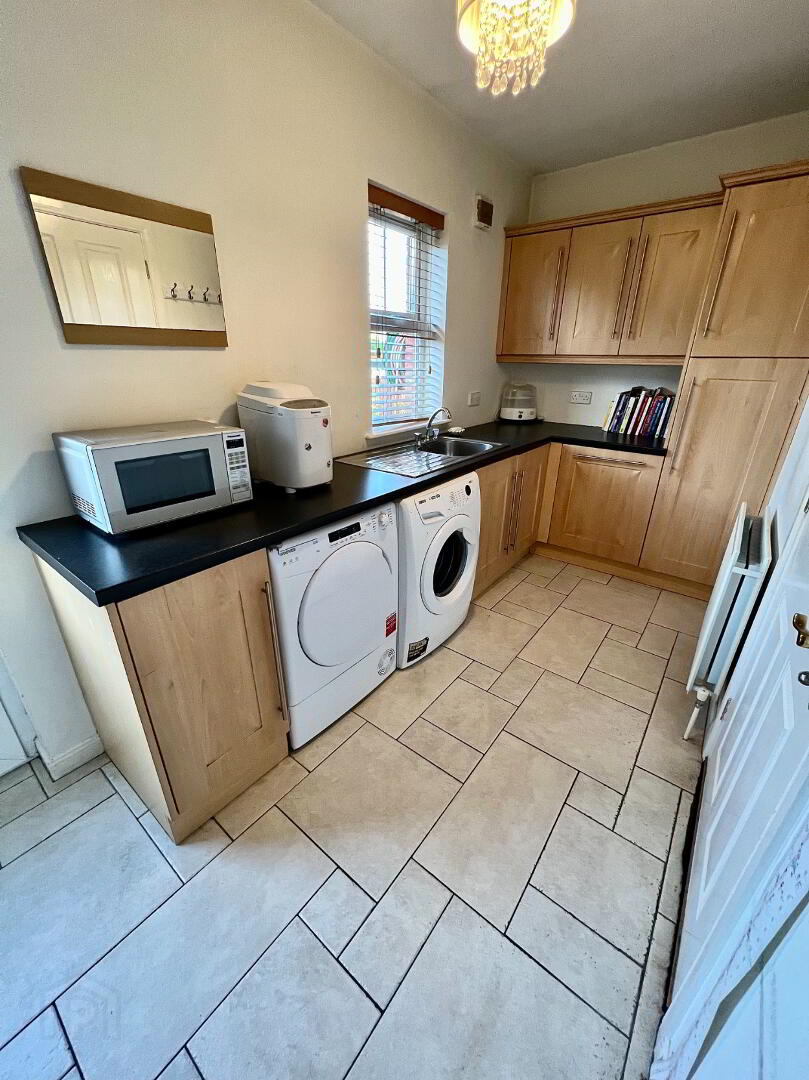 Utility Room 14'8 x 5'10 Eye and low level units, single drainer stainless steel sink unit with mixer tap, plumbed for washing machine, space for tumble dryer, tiled floor