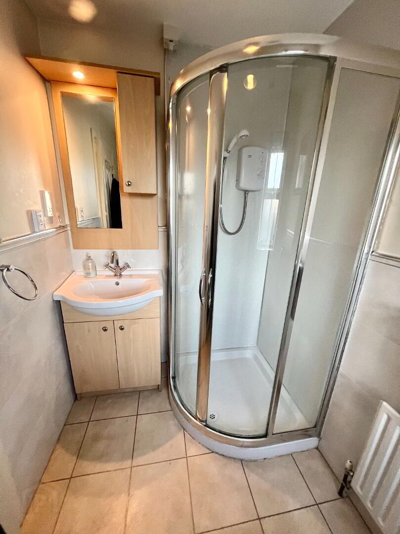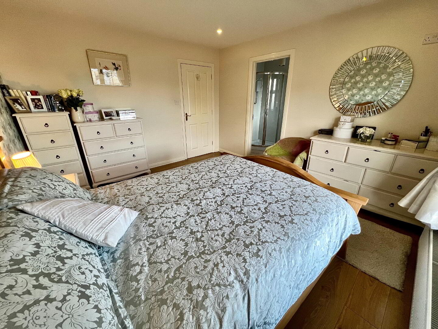 Bedroom 1 12'7 x 11'3 Laminated wooden floor, recessed lighting. En-suite; Walk in electric shower, wash hand basin set in vanity unit, WC partly tiled walls, tiled floor