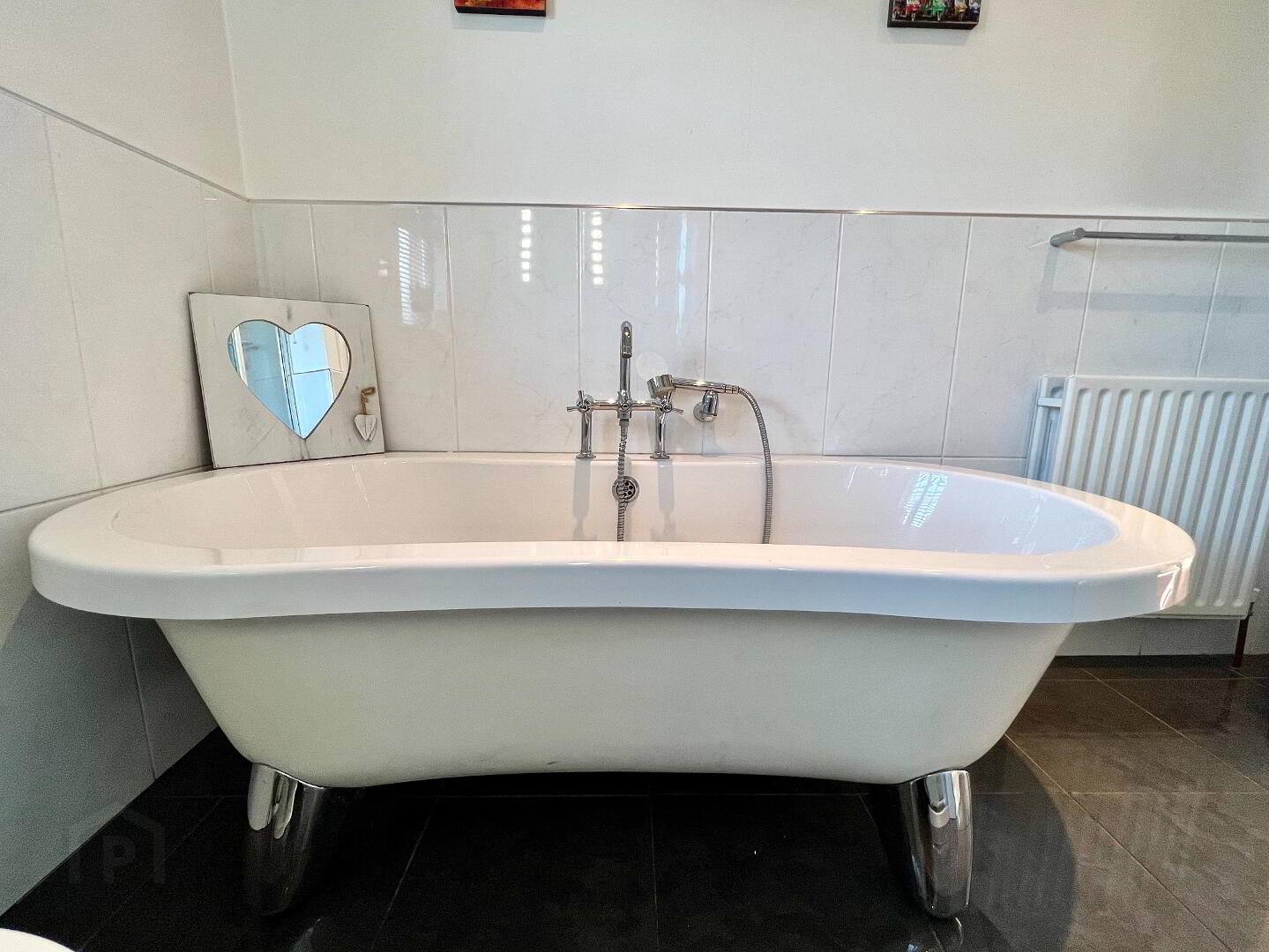 Bathroom 9'8 x 7'10 (to widest points) Free standing bath, wash hand basin and WC, walk in shower, partly tiled walls, tiled floor, recessed lighting