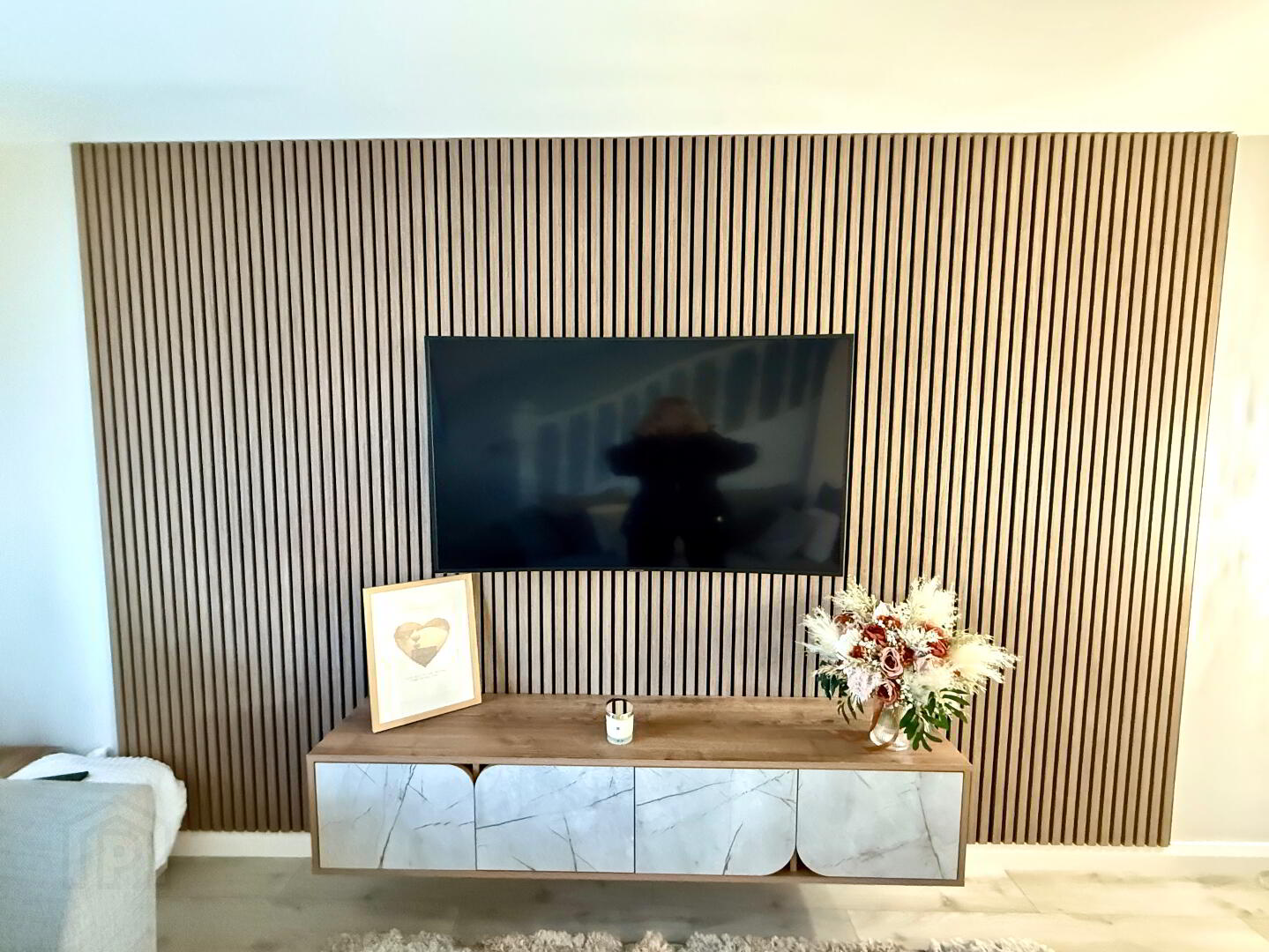 Lounge with feature wood panelled wall with floating shelves, laminated wooden floor.
