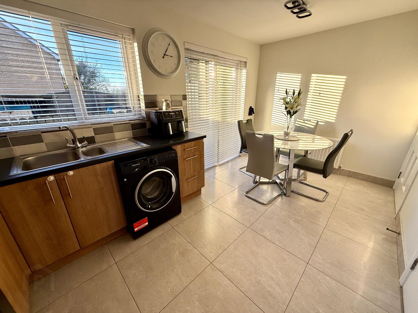 Kitchen/Dining Eye and low level units, 1 1/2 bowl stainless steel sink unit with mixer tap, hob, oven and extractor fan, plumbed for washing machine, integrated fridge/freezer, partly tiled walls, tiled floor, patio door.