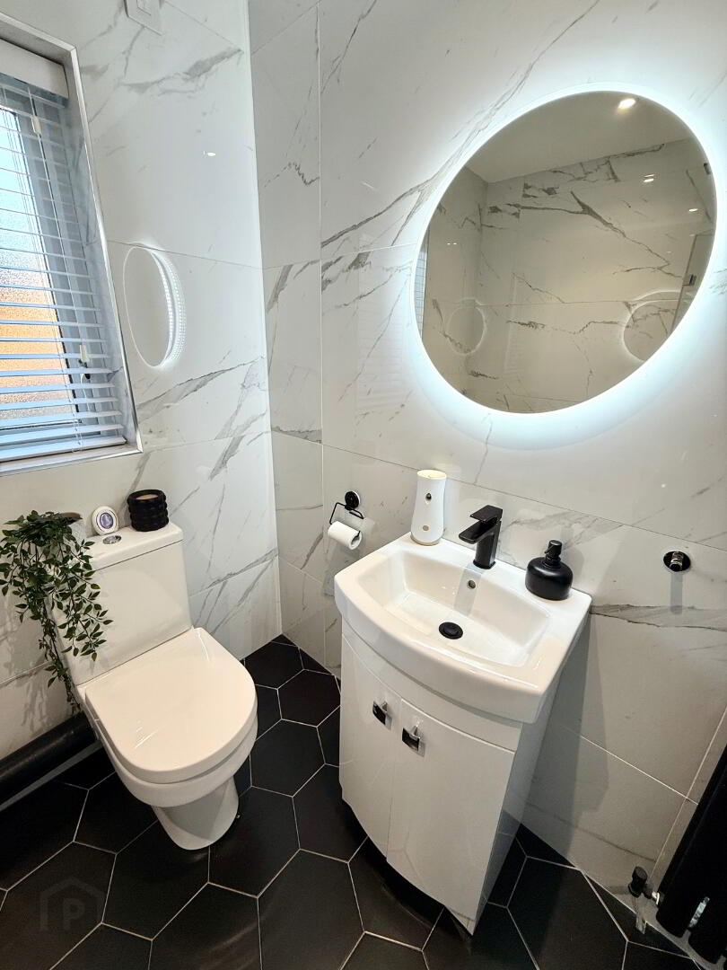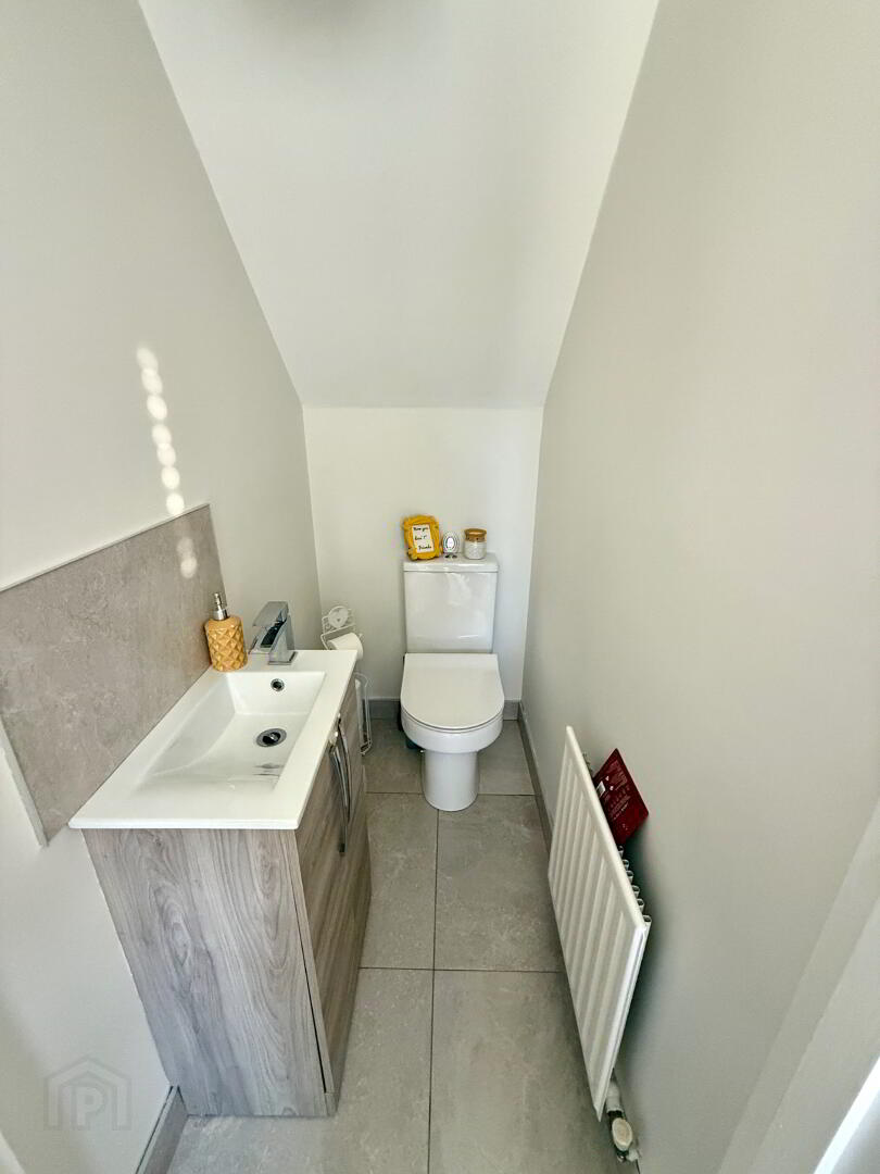 Downstairs WC WC and wash hand basin set in vanity unit, tiled floor.