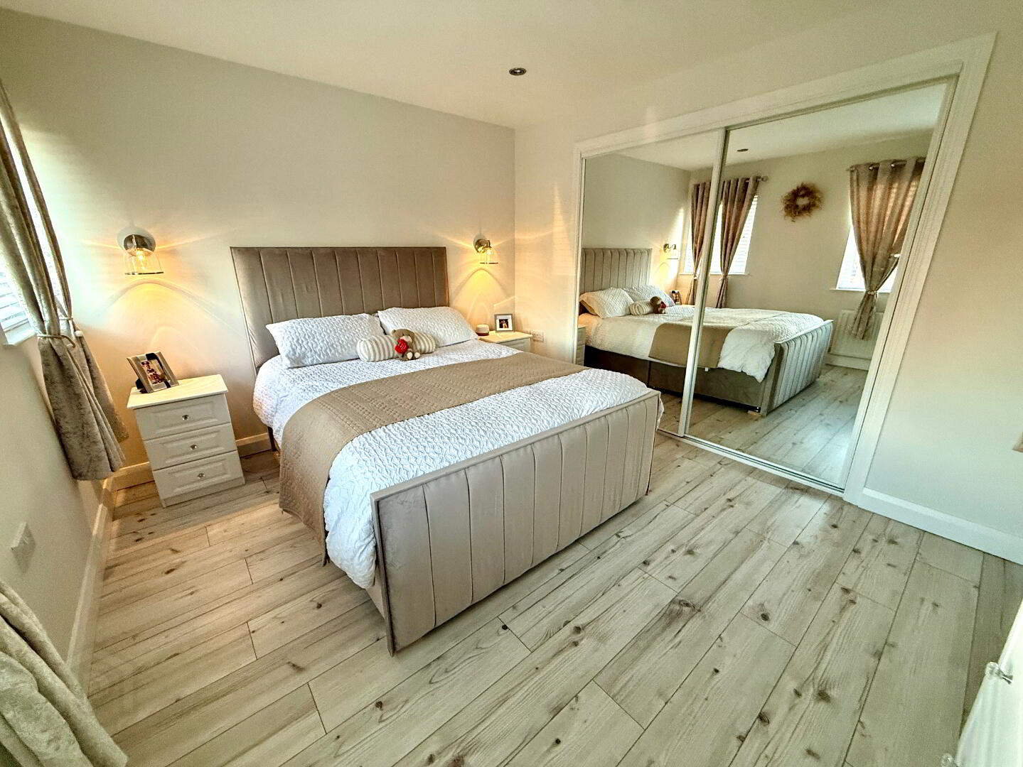 Bedroom 1 Fitted with mirror sliderobes, laminated wooden floor, wall lights, recessed lighting.