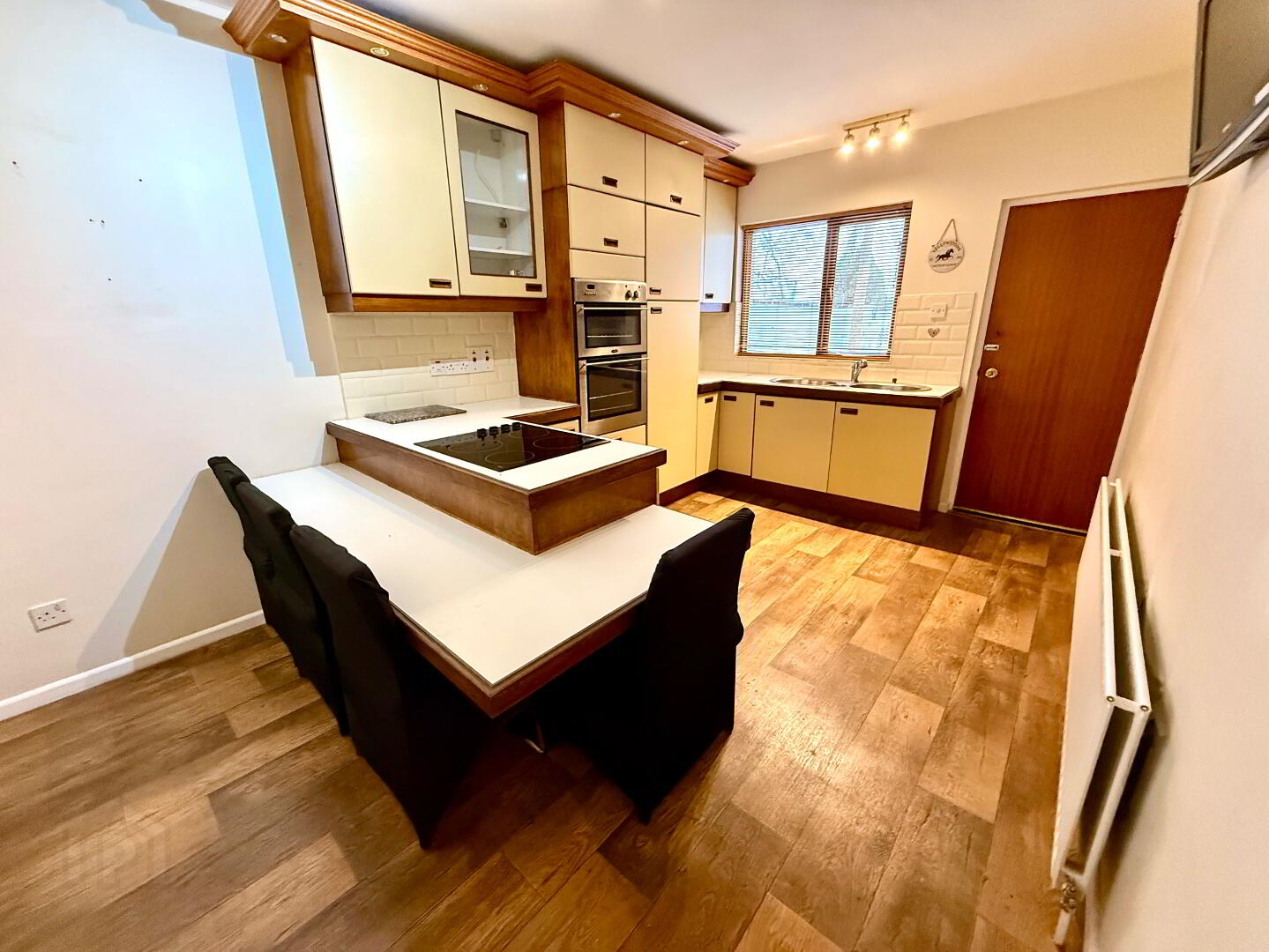 Kitchen/Dining 14'11 x 9'8 Eye and low level units, double sink unit with mixer tap, hob, double wall oven, glazed display unit, breakfast bar with seating, partly tiled walls.