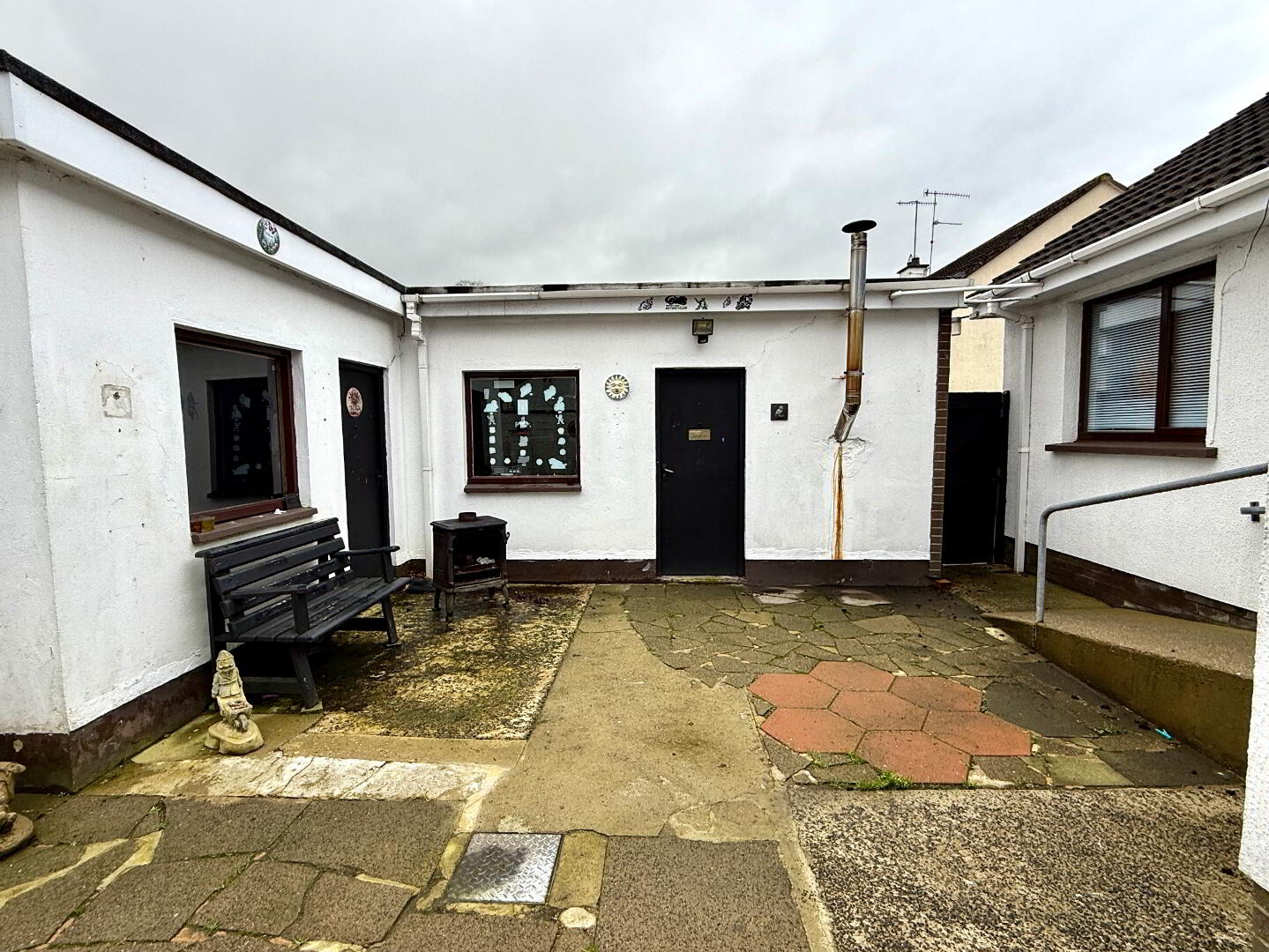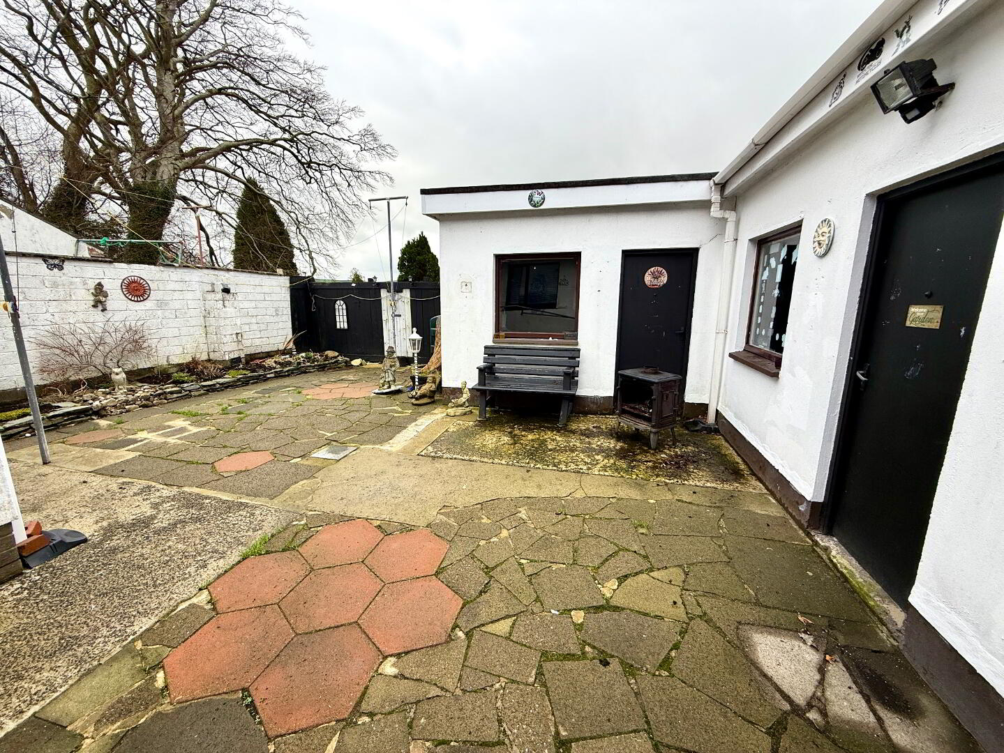 Paved yard to rear enclosed wall and fence.