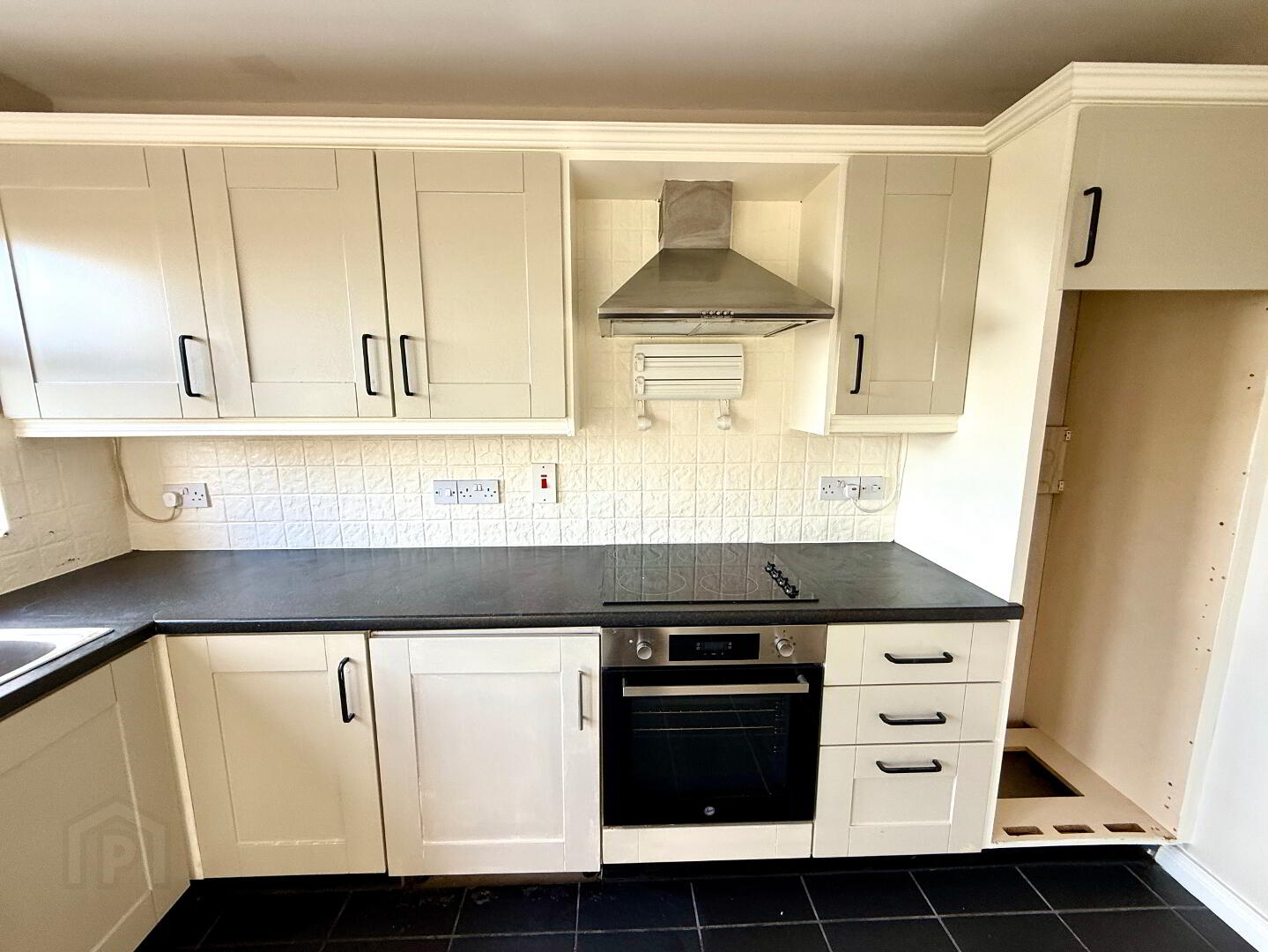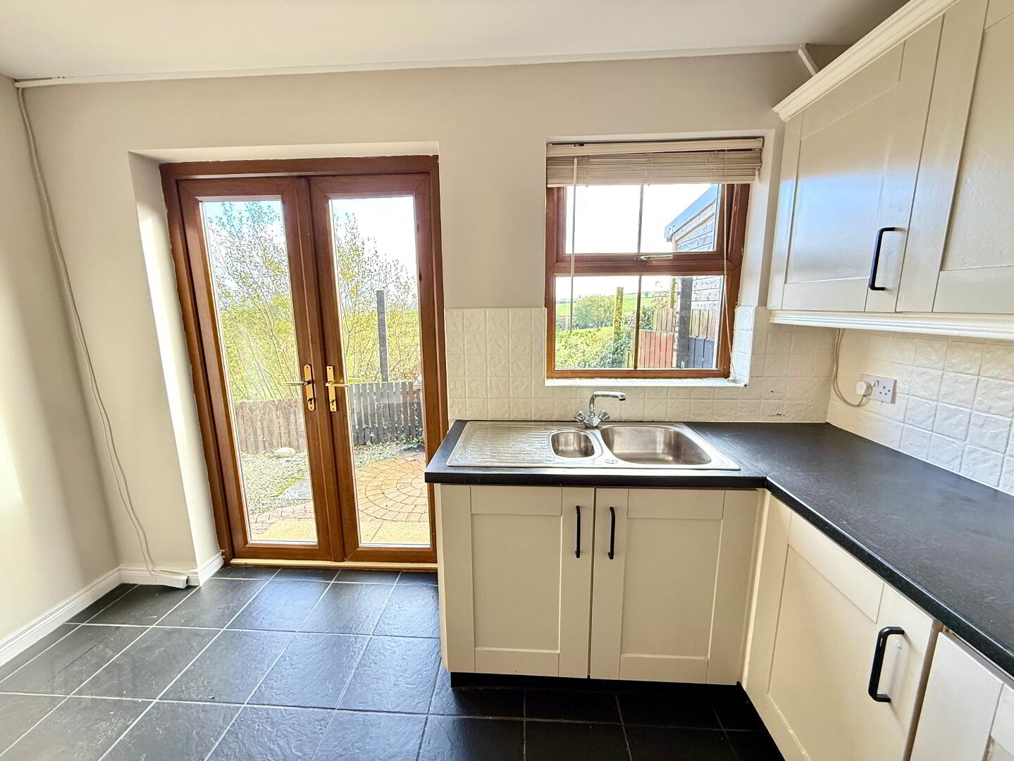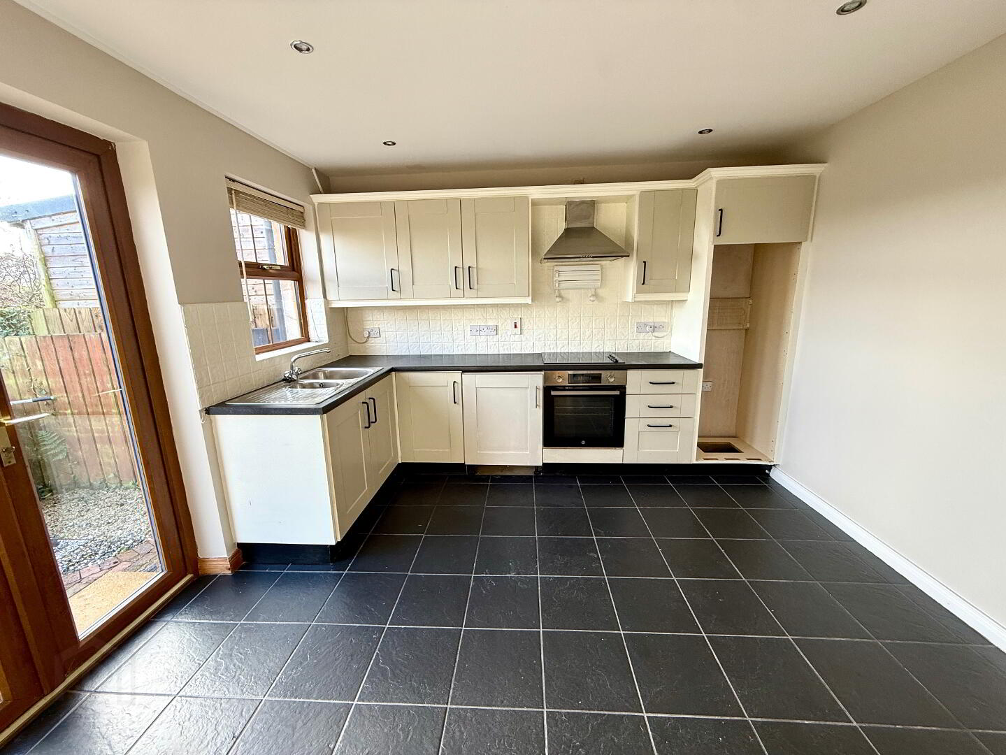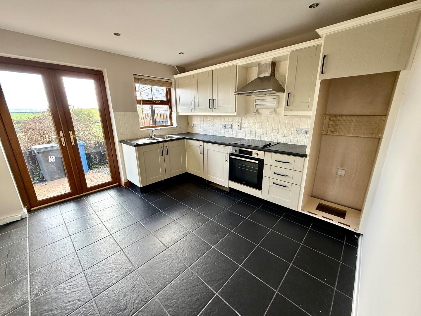 Kitchen/Dining 11'4 x 11'4 Eye and low level units, 1 1/2 bowl stainless steel sink unit with mixer tap, hob, oven and extractor fan, partly tiled walls, tiled floor, double patio doors.