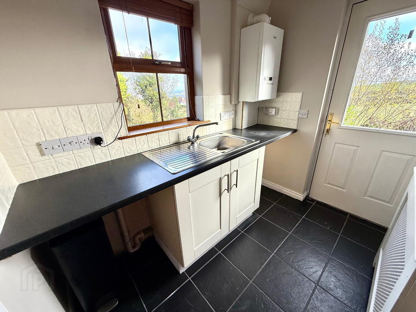 Utility Room Low level units, single drainer stainless steel sink unit with mixer tap, partly tiled walls, tiled floor.