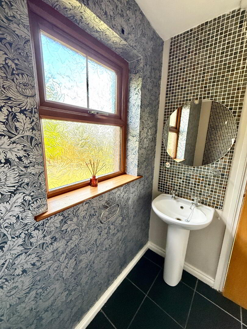 Downstairs WC WC and wash hand basin, partly tiled walls, tiled floor.