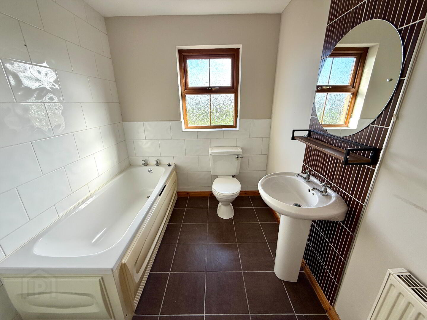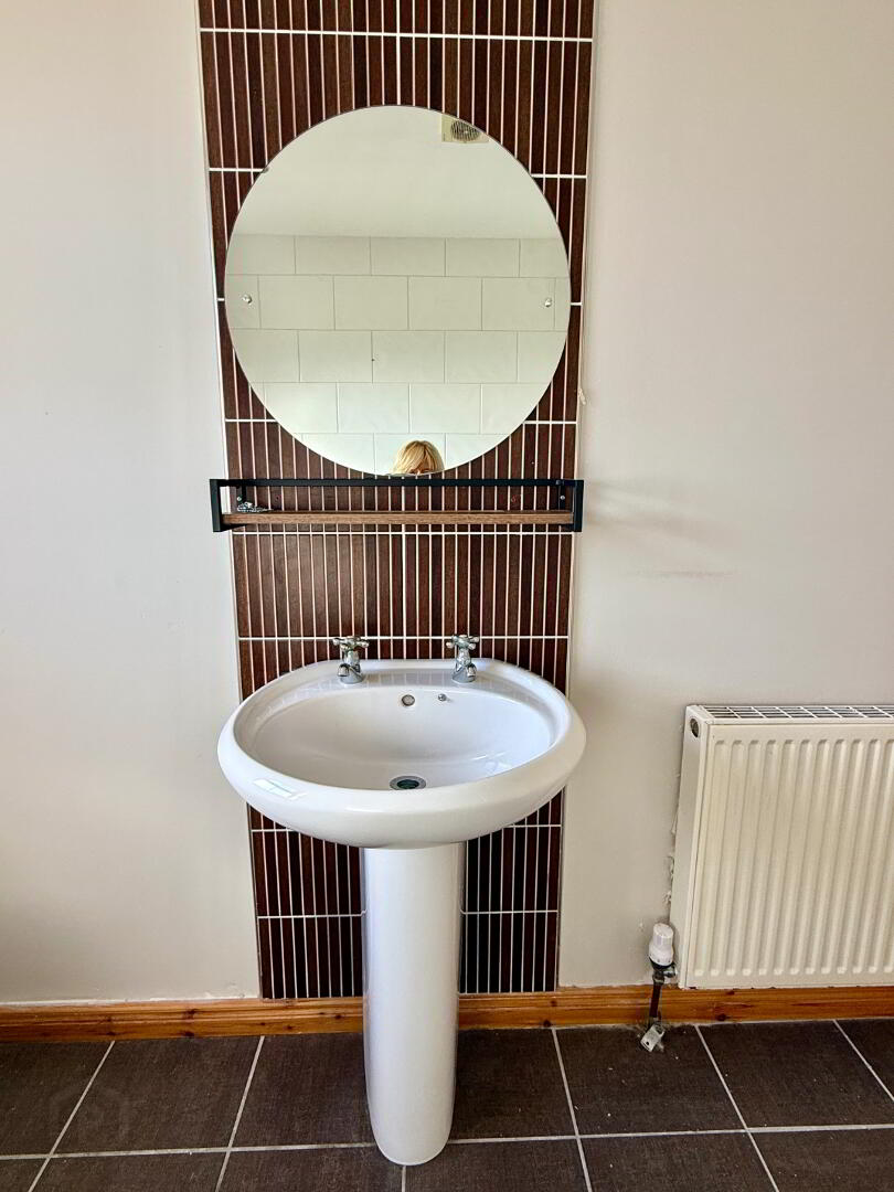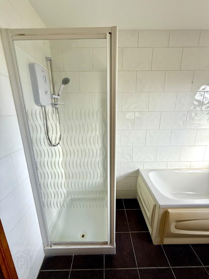Bathroom Bath, wash hand basin and WC, walk in electric shower, partly tiled walls, tiled floor.