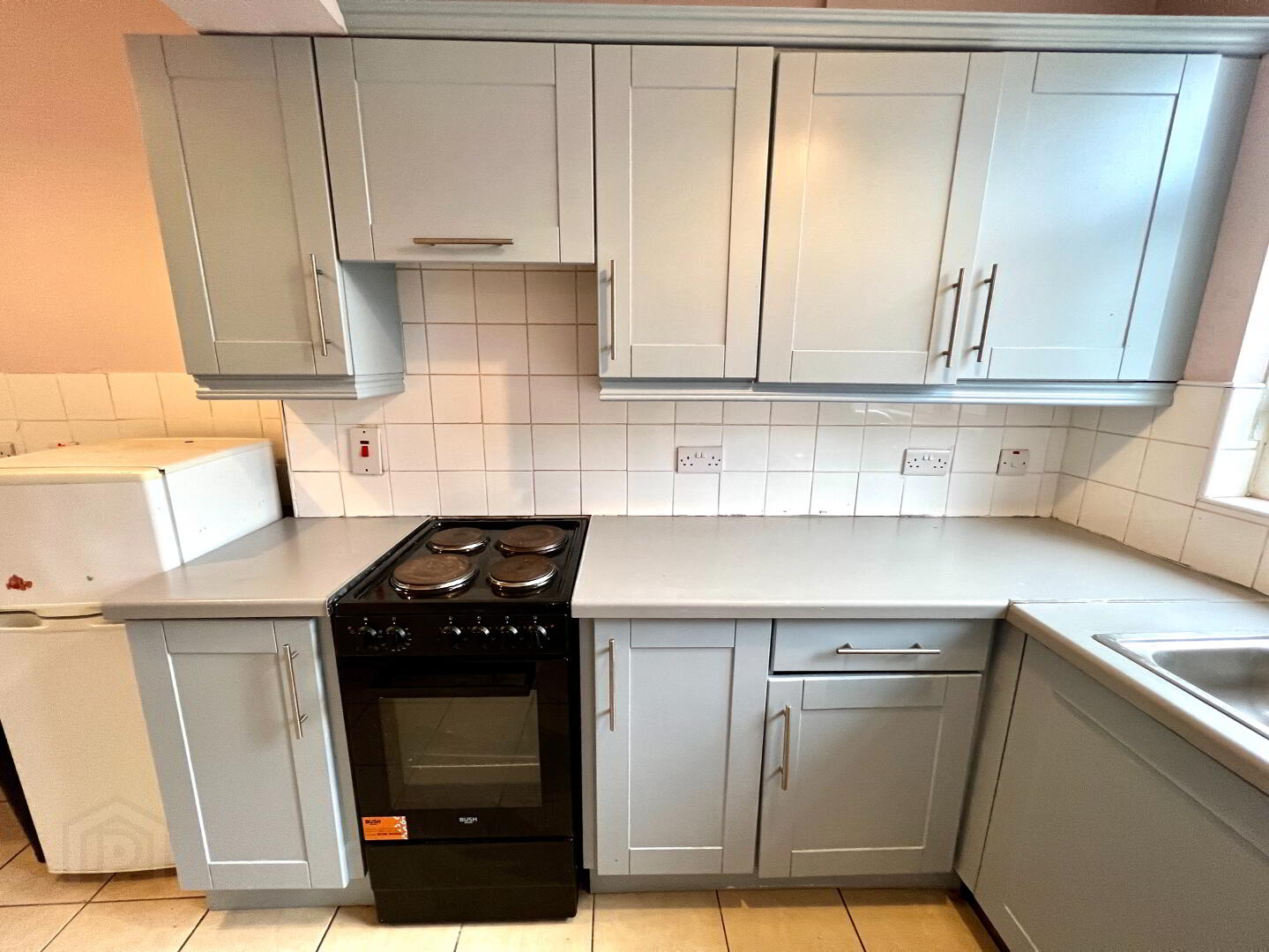 Bathroom  Bath with electric shower overhead, wash hand basin and WC, partly tiled walls.