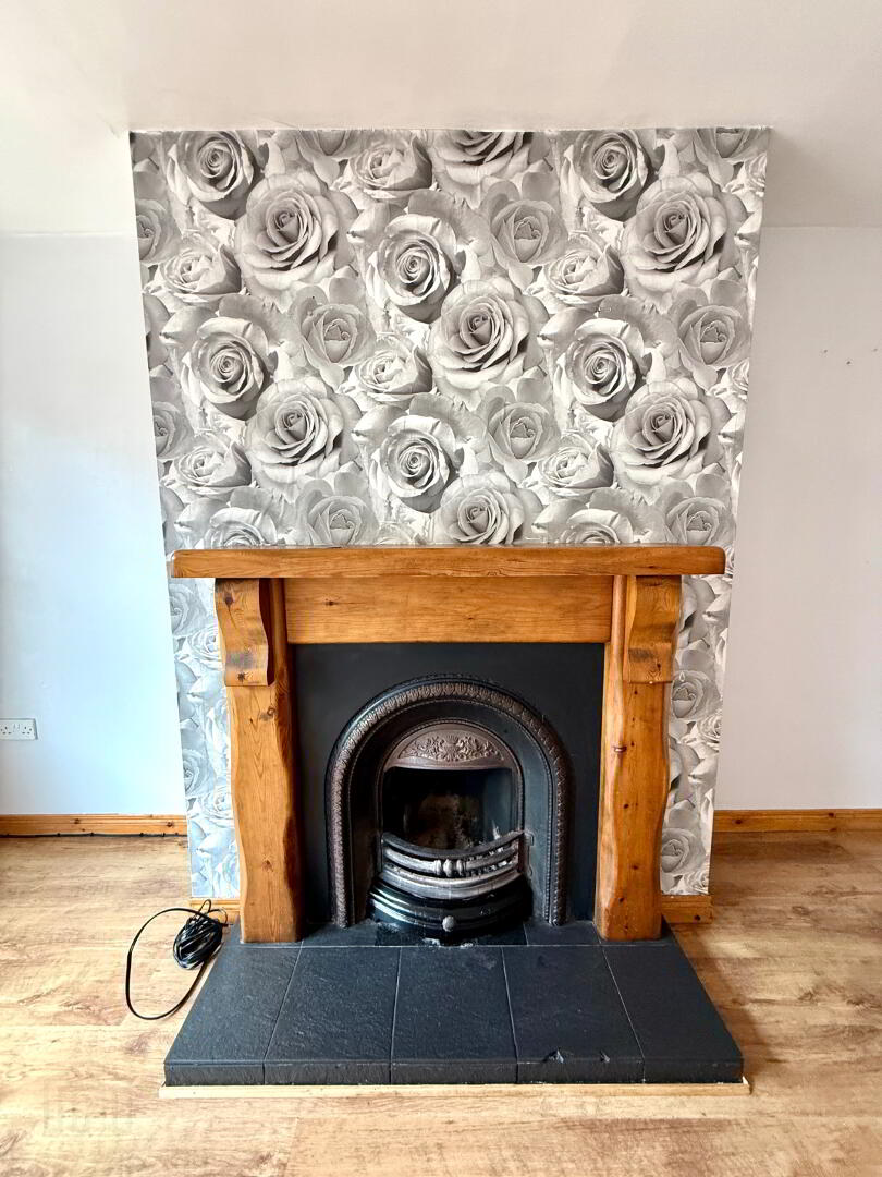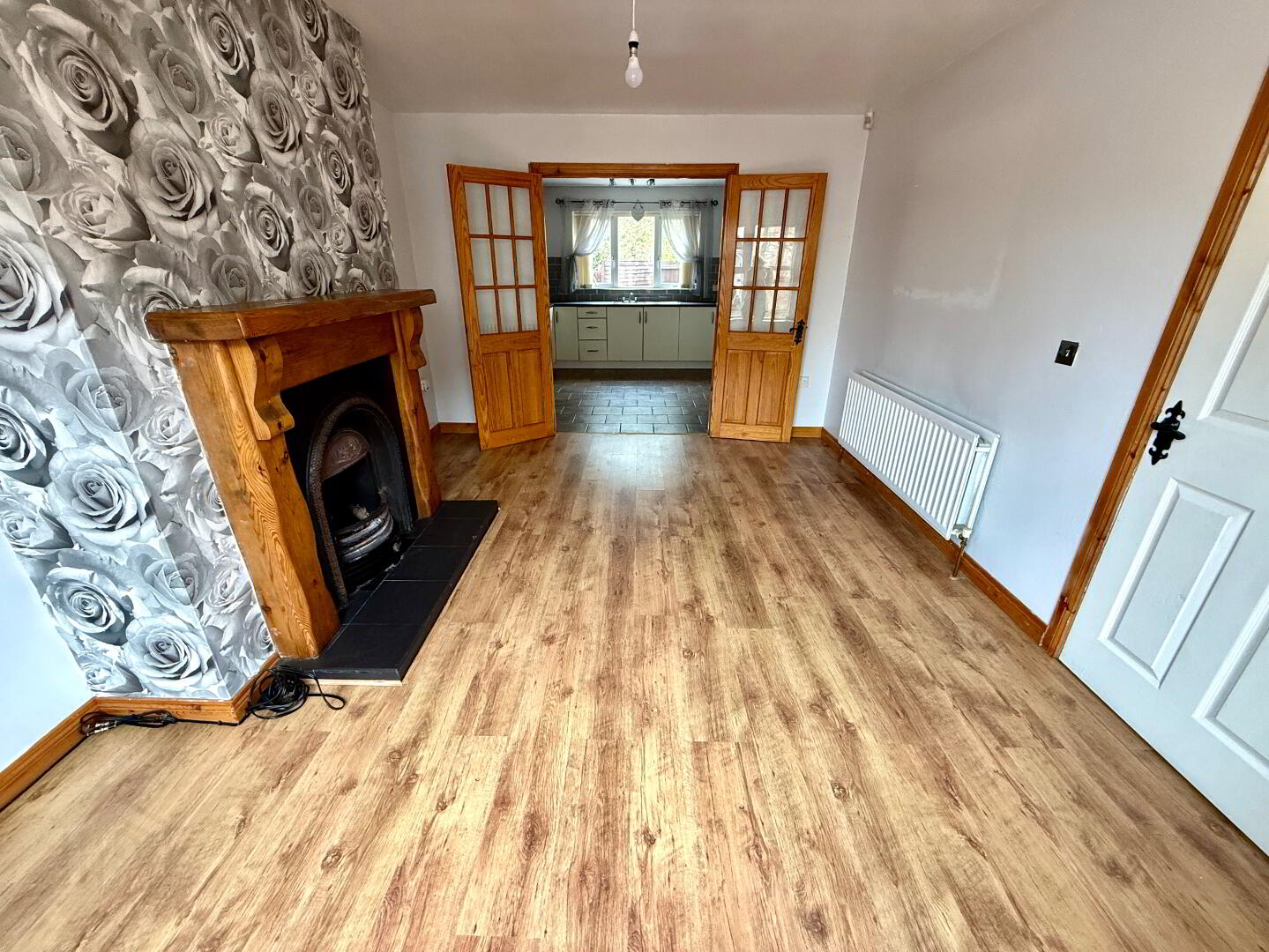 Lounge 14'4 x 11' (to widest points) Cast iron fireplace with wooden surround and tiled hearth, double doors to kitchen, laminated wooden floor.