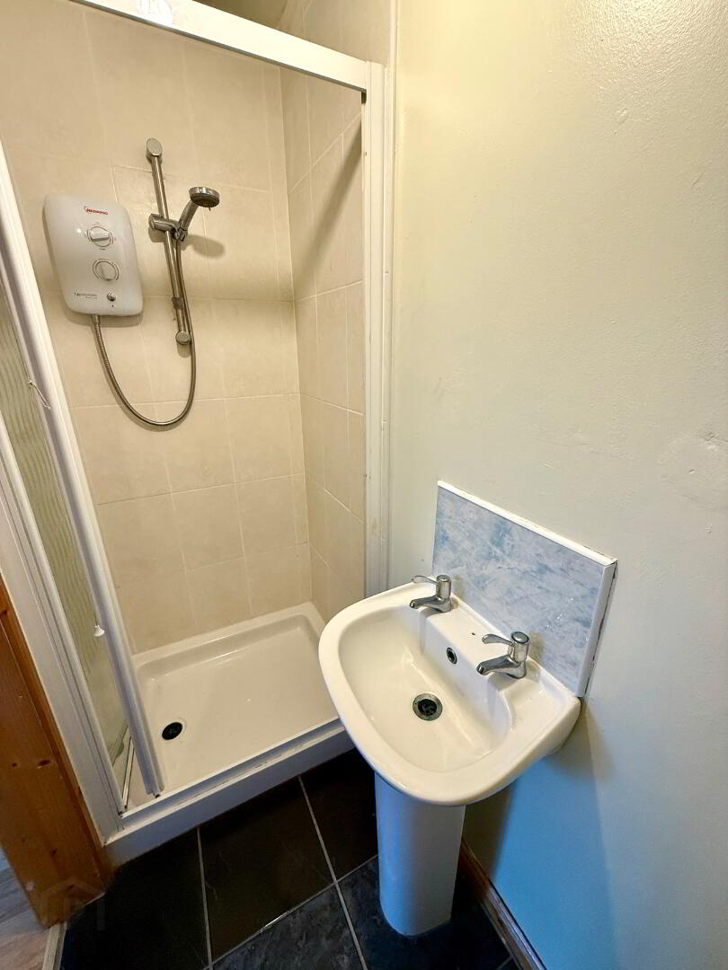 En-suite Fully tiled walk in electric shower, wash hand basin and WC, tiled floor.