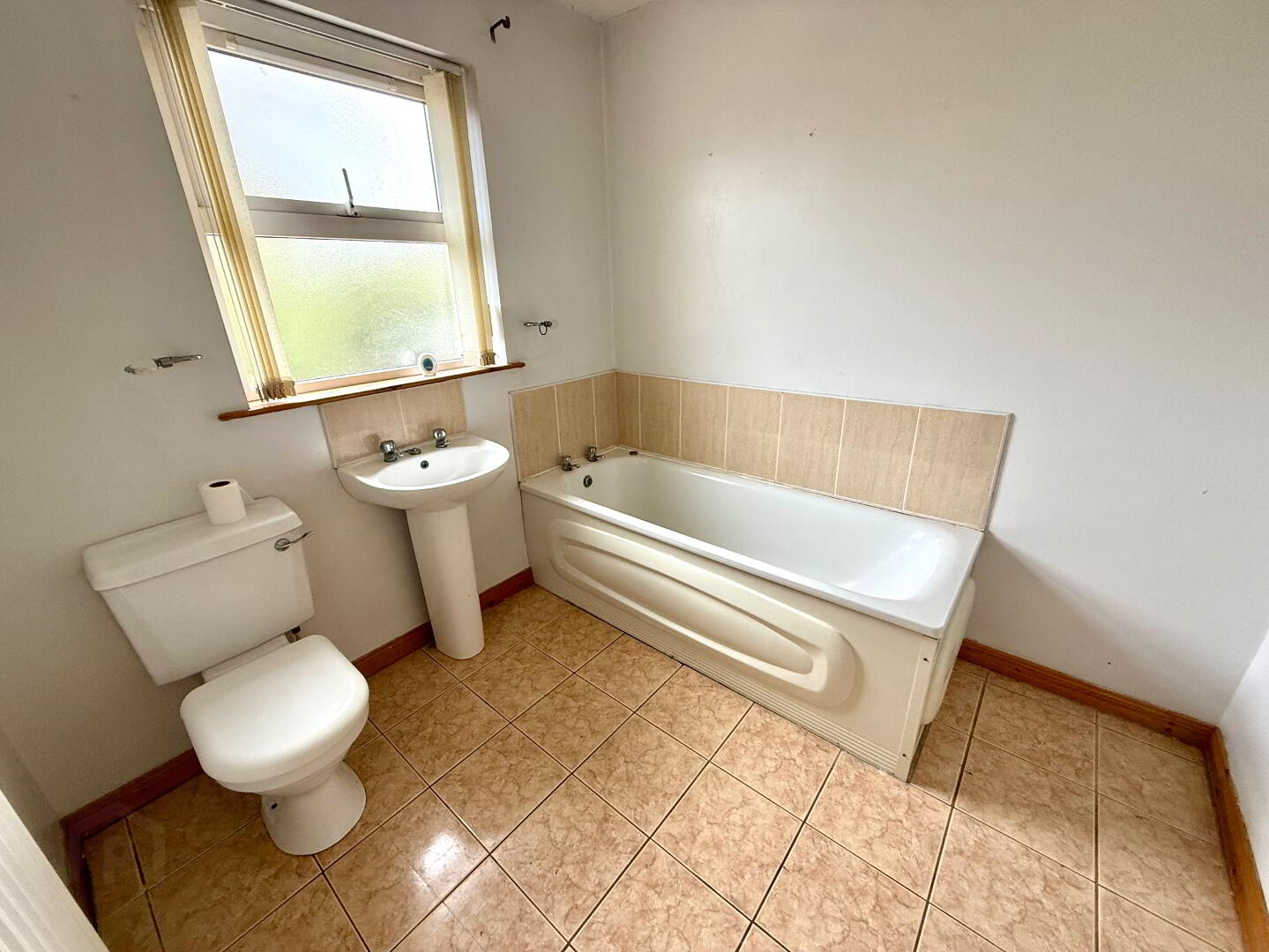 Bathroom Bath, wash hand basin and WC, partly tiled walls, tiled floor.