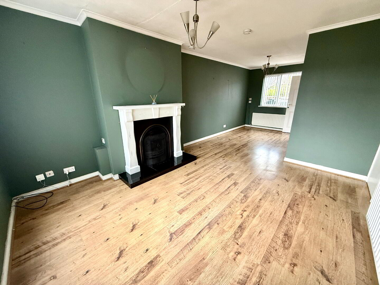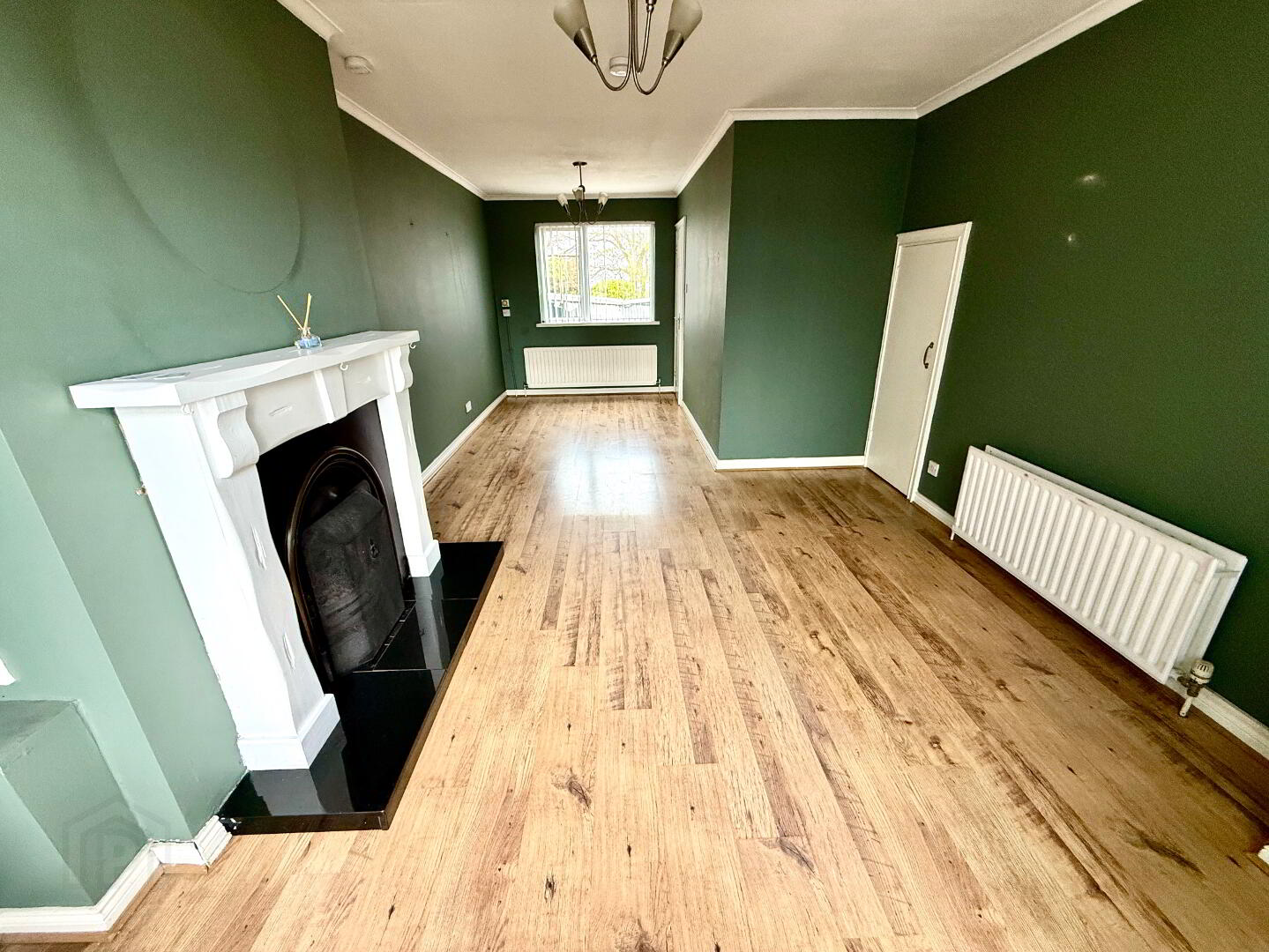 Lounge/Dining 23'5 x 11'6 (to widest points) Cast iron fireplace with wooden surround and tiled hearth, ceiling cornicing, understairs storage, laminated wooden floor.