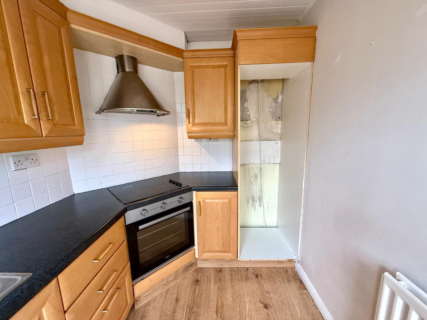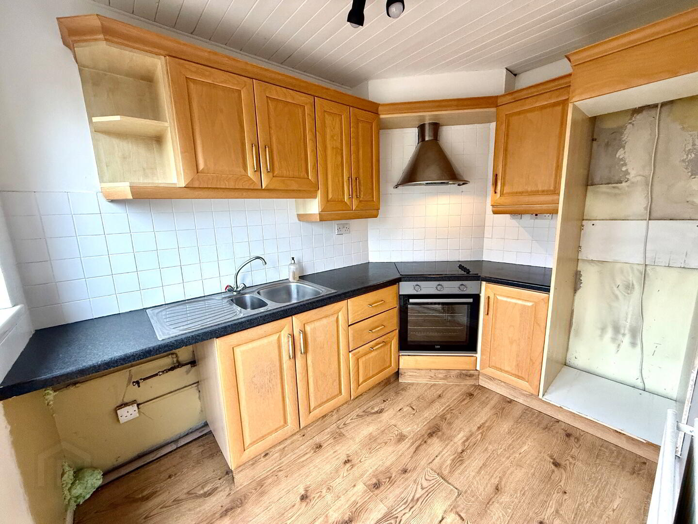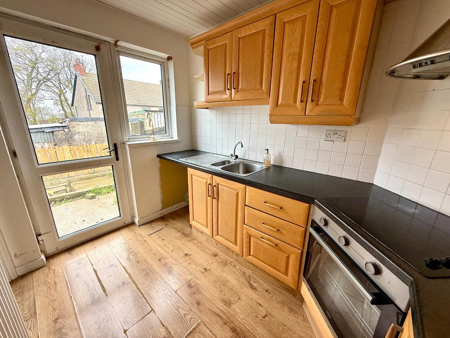 Kitchen 9'8 x 6'8 (to widest points) Eye and low level units, 1 1/2 bowl stainless steel sink unit with mixer tap, hob, oven and extractor fan, plumbed for washing machine, partly tiled walls, laminated wooden floor.