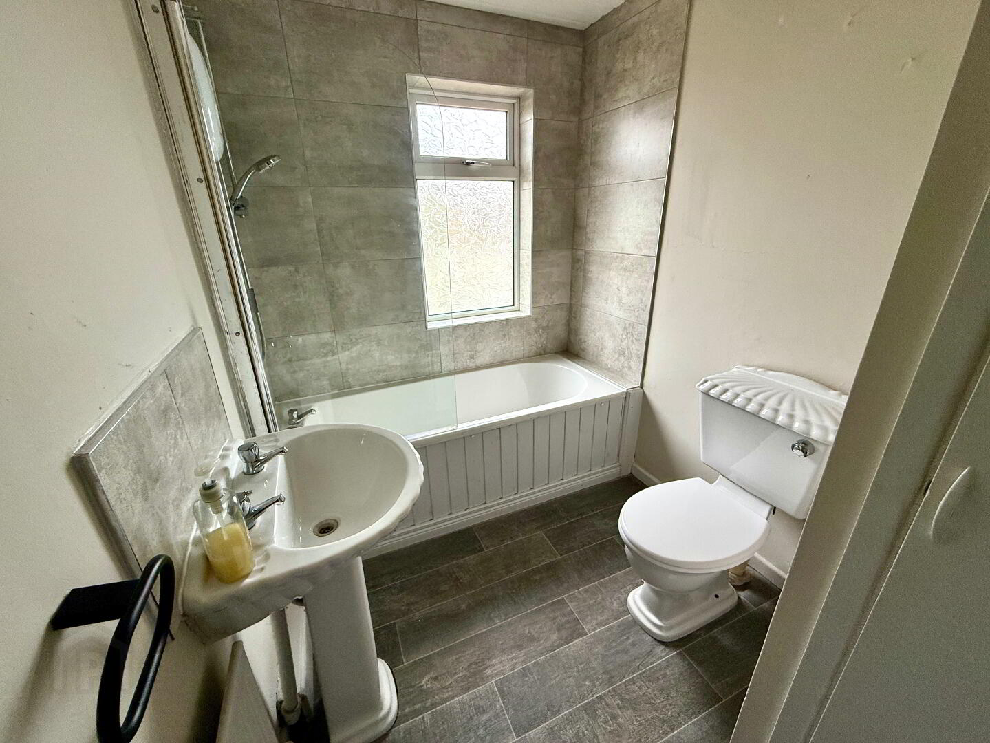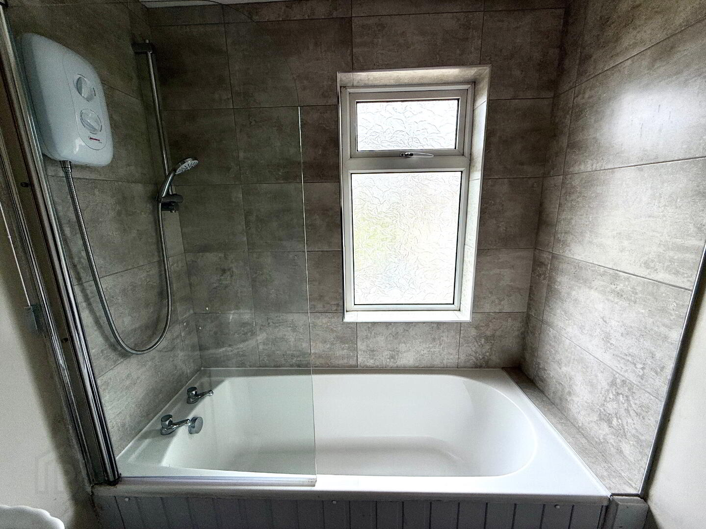 Bathroom Bath with electric shower overhead, wash hand basin and WC, partly tiled walls.