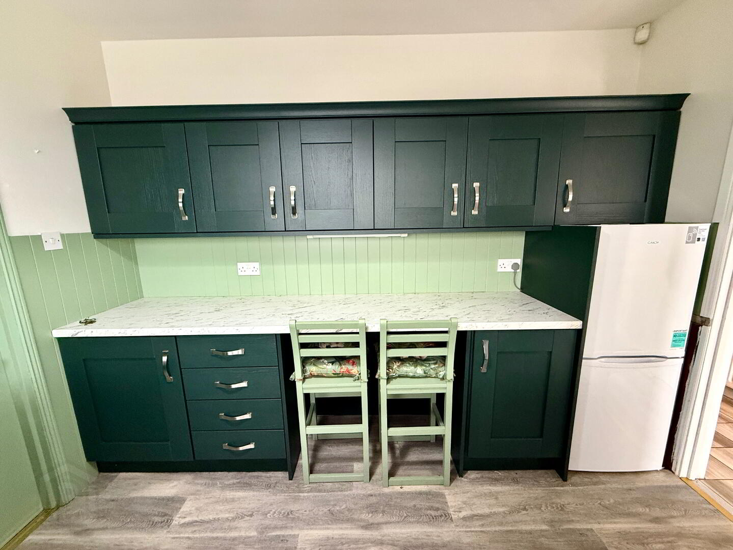 Kitchen 10'5 x 10'5 (to widest points) Eye and low level units, single drainer stainless steel sink unit with mixer tap, wired for electric cooker, plumbed for washing machine, breakfast bar.