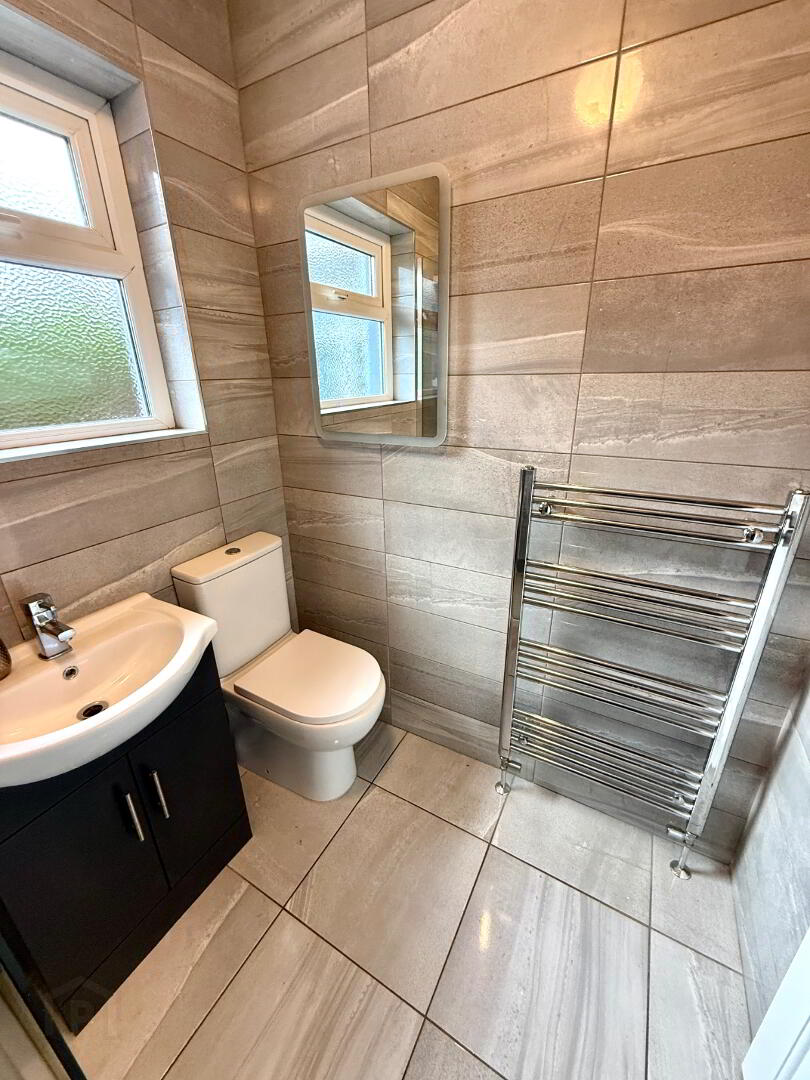 Shower Room Fully tiled walk in shower, wash hand basin set in vanity unit, WC, fully tiled walls, tiled floor.