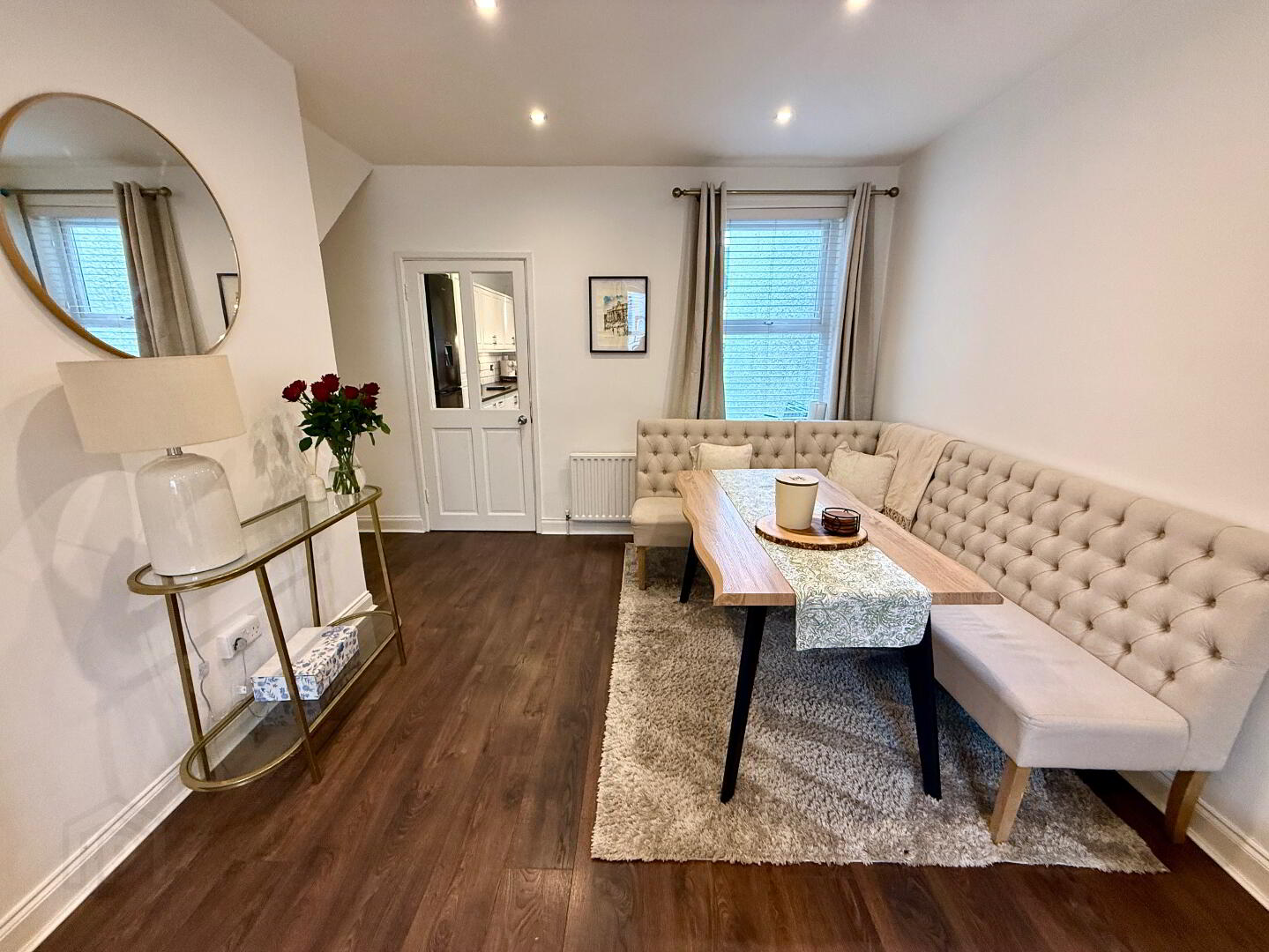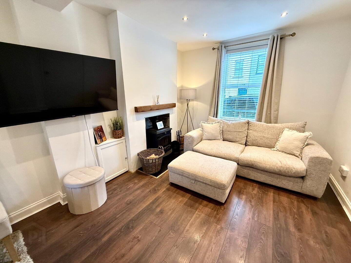 Lounge/Dining 20'5 x 13'10 (to widest points) Multi fuel stove with high output back boiler, laminated wooden floor, recessed lighting.