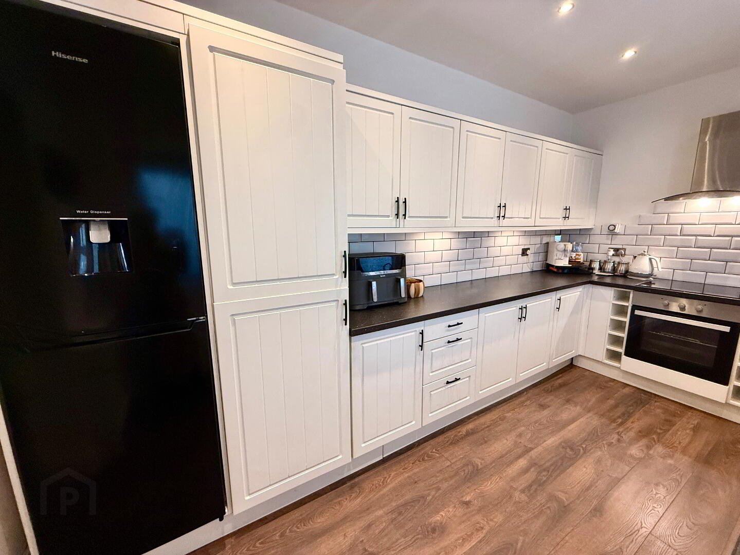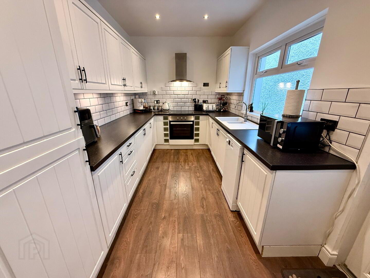 Kitchen 14'8 x 7'11 Eye and low level units, 1 1/2 bowl ceramic sink unit, hob, oven and extractor fan, plumbed for dishwasher, larder cupboard, wine rack, partly tiled walls, lamianted wooden floor, recessed lighting.