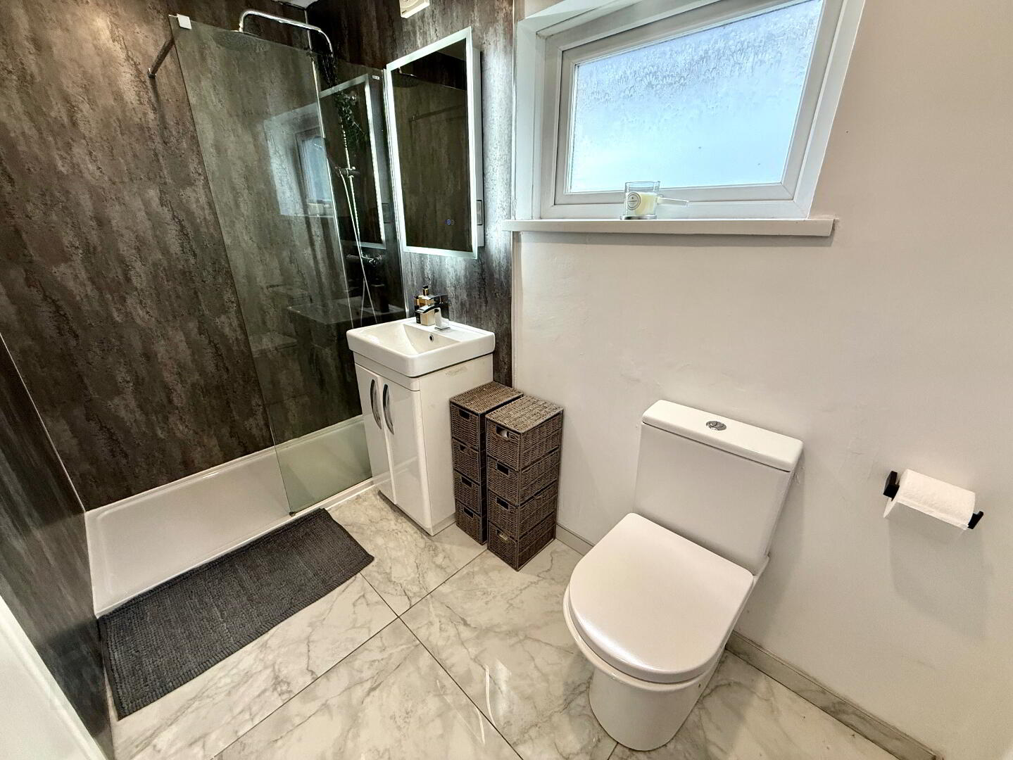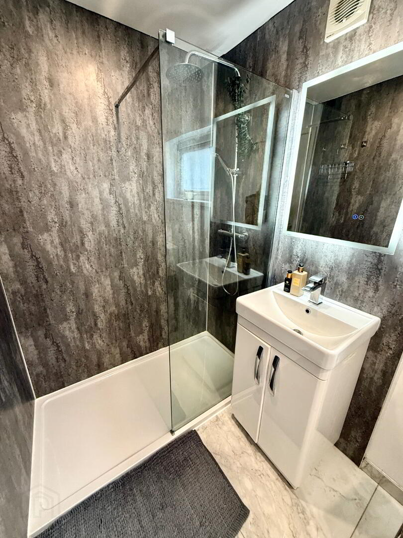 Shower Room Fully panelled walk in shower, wash hand basin set in vanity unit, WC, heated towel rail, tiled floor, recessed lighting.