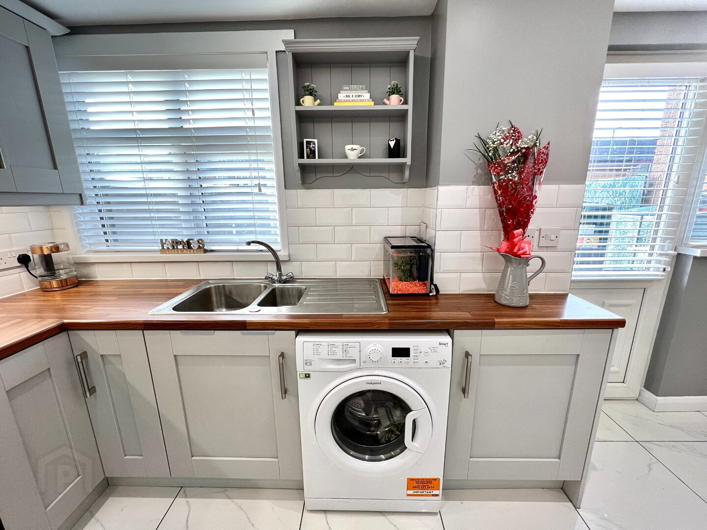 Kitchen/Dining 17'6 x 12'8 (to widest points) Eye and low level units, 1 1/2 bowl stainless steel sink unit with mixer tap, integrated fridge/freezer, plumbed for washing machine, open display shelves, hob, oven and extractor fan, partly tiled walls, tiled floor, featured wood panelled wall, radiator cover, featured ceiling with concealed lighting and recessed lighting.