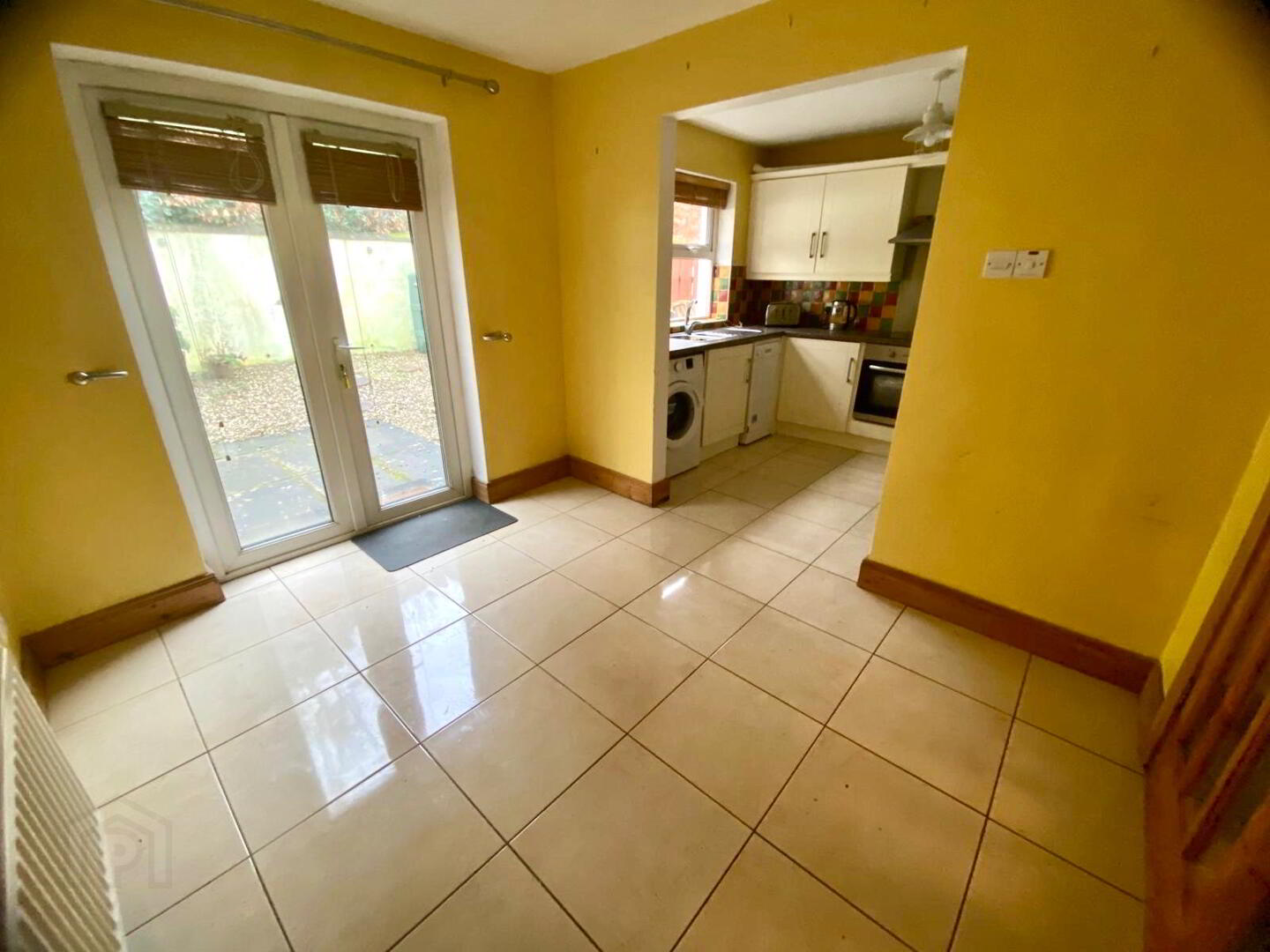 Kitchen/Dining  16'9 x 10' (to widest points)  Eye and low level units, 1 1/2 bowl stainless steel sink unit with mixer tap, hob, oven and extractor fan, partly tiled walls, plumbed for washing machine, plumbed for dishwasher, tiled floor, double patio doors.