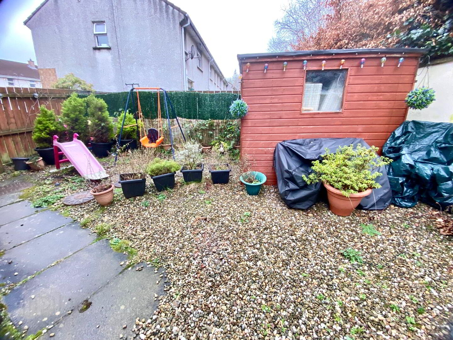 Stoned garden to side and rear enclosed by fence and wall.
