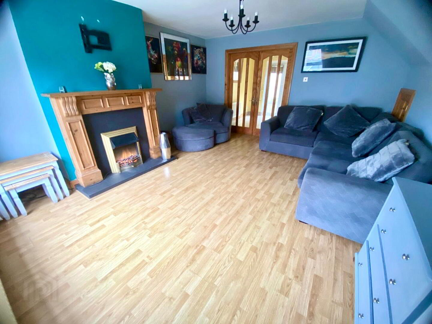 Lounge  15'8 x 13'5 (to widest points)  Tiled fireplace and hearth with wooden surround, laminated wooden floor, double doors to kitchen/dining.