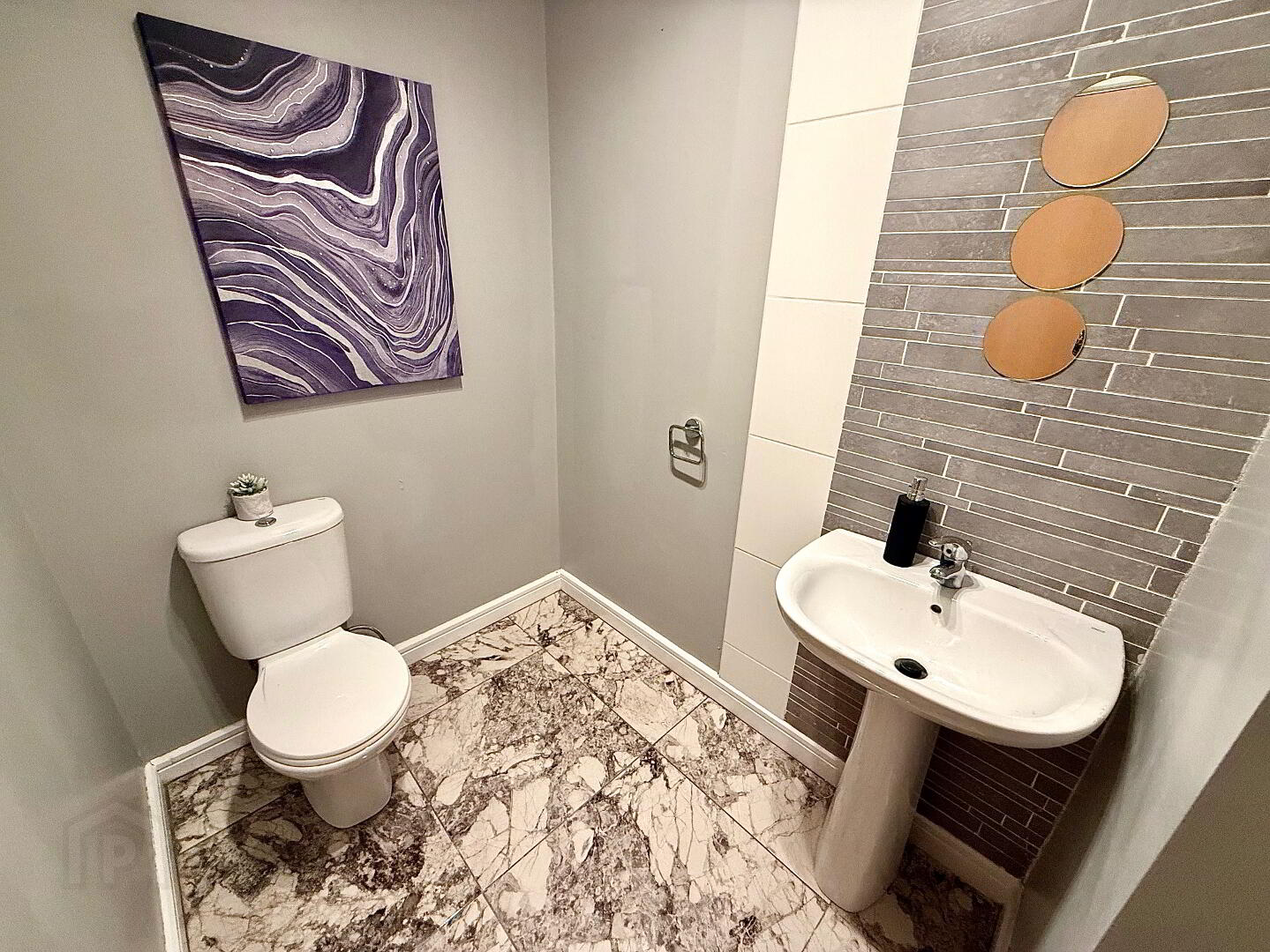 Downstairs WC WC and wash hand basin, partly tiled walls, tiled floor