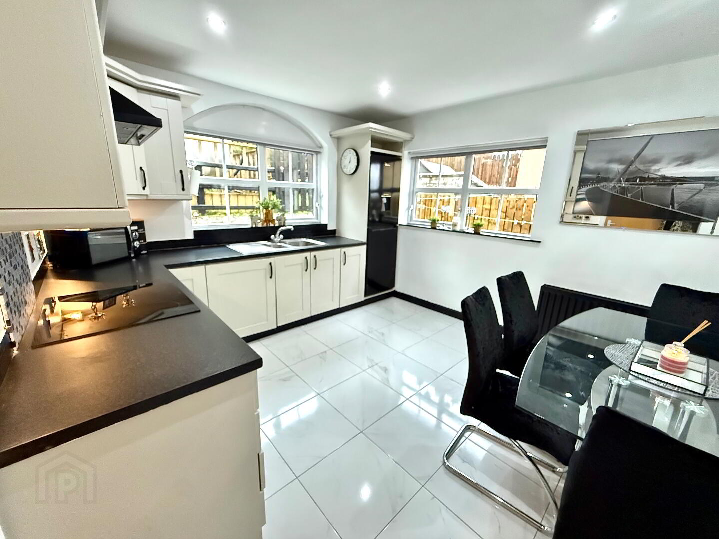 Kitchen/Dining 11'7 x 10'11 Dual aspect, eye and low level units, 1 1/2 bowl stainless steel sink unit with mixer tap, hob, oven and extractor fan, partly tiled walls, tiled floor, recessed lighting.