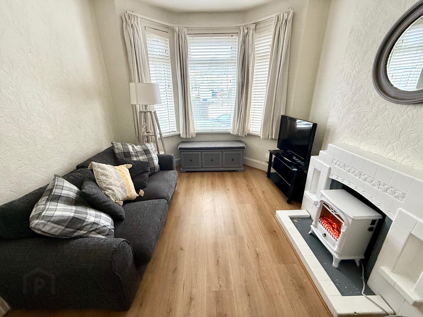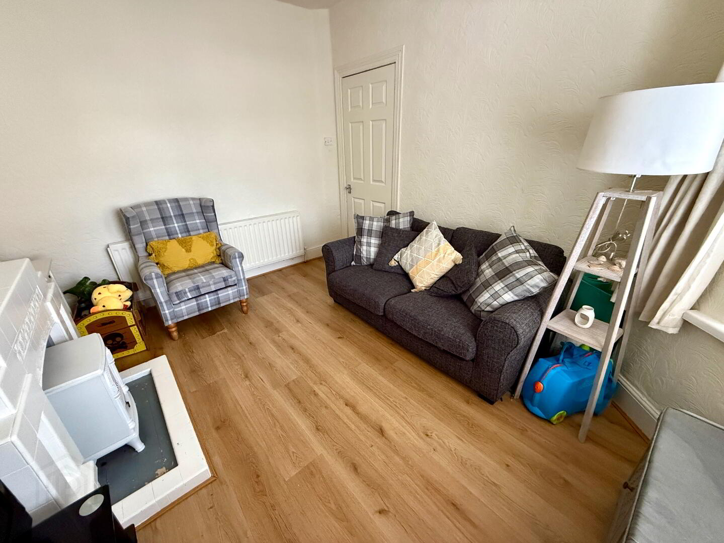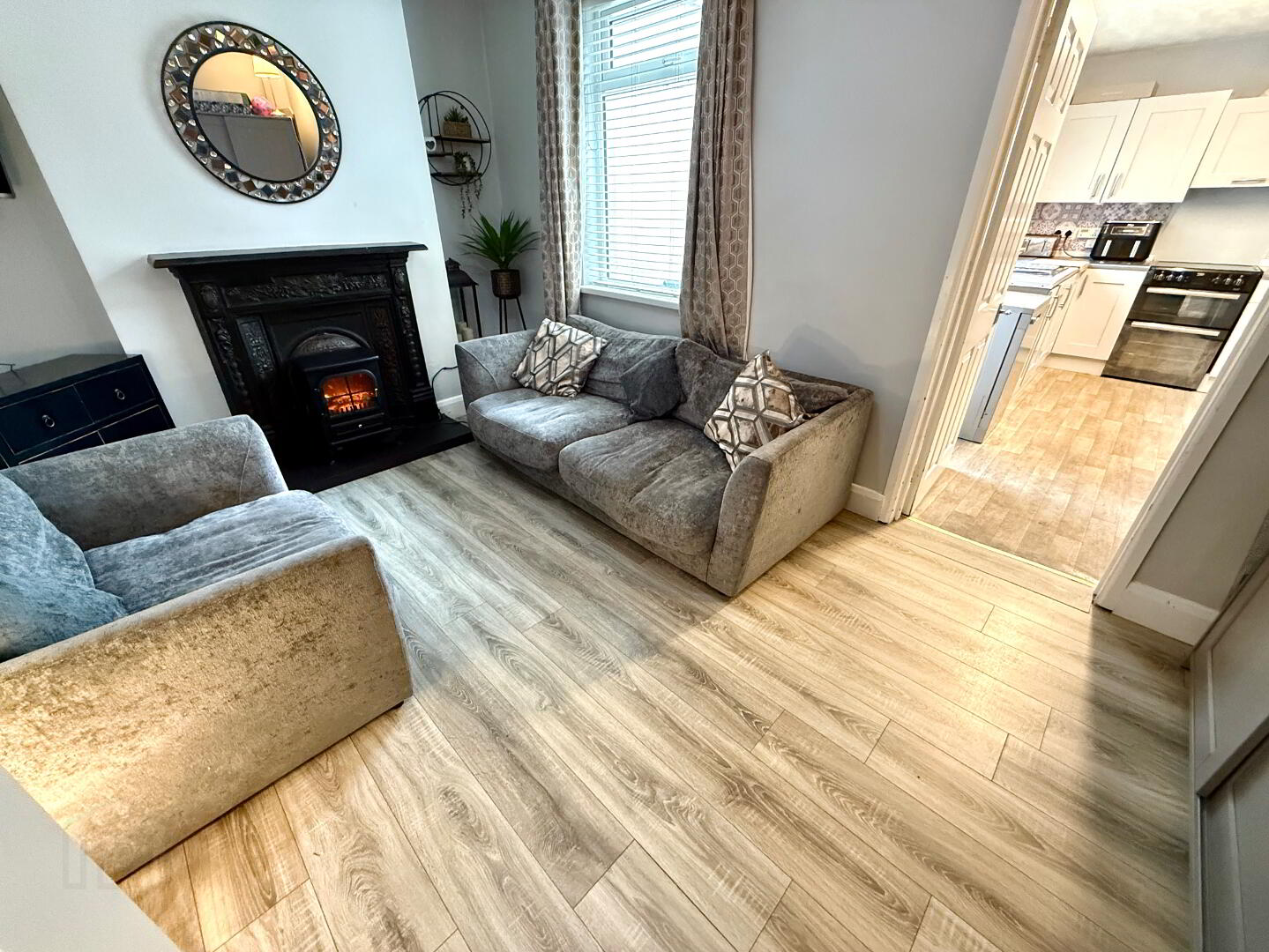 Family Room 15'9 x 9'9 (to widest points) Cast iron fireplace with tiled hearth, understairs storage, laminated wooden floor.