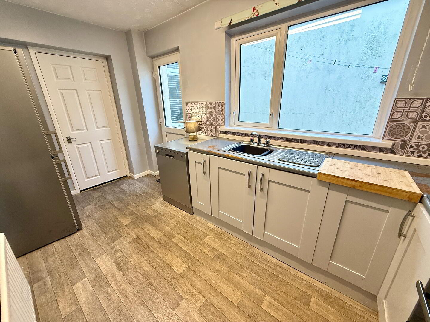 Kitchen 13'8 x 7' Eye and low level units, single drainer stainless steel sink unit with mixer tap, electric cooker and extractor fan, plumbed for washing machine.