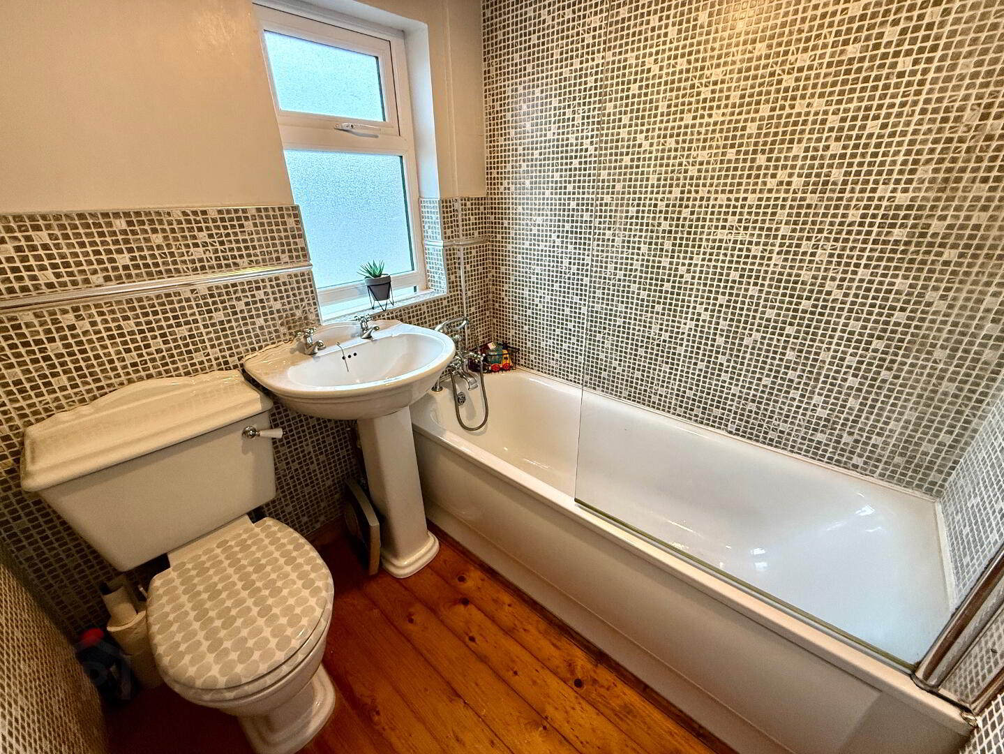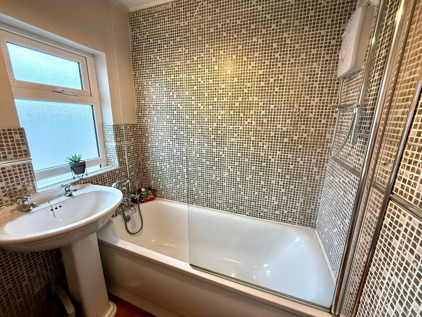 Bathroom Bath with electric shower overhead, wash hand basin and WC, partly tiled walls, wooden floor.