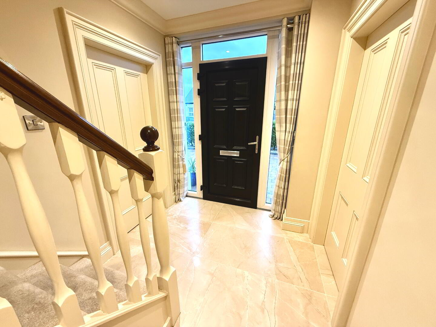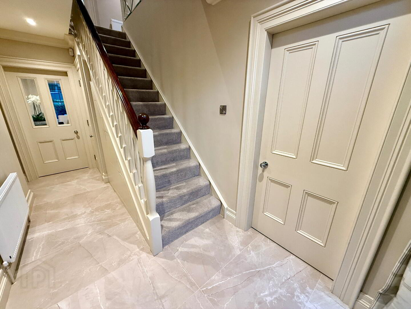 Entrance Hall  with tiled floor, cloak cupboard, understair storage, ceiling cornicing, recessed lighting.