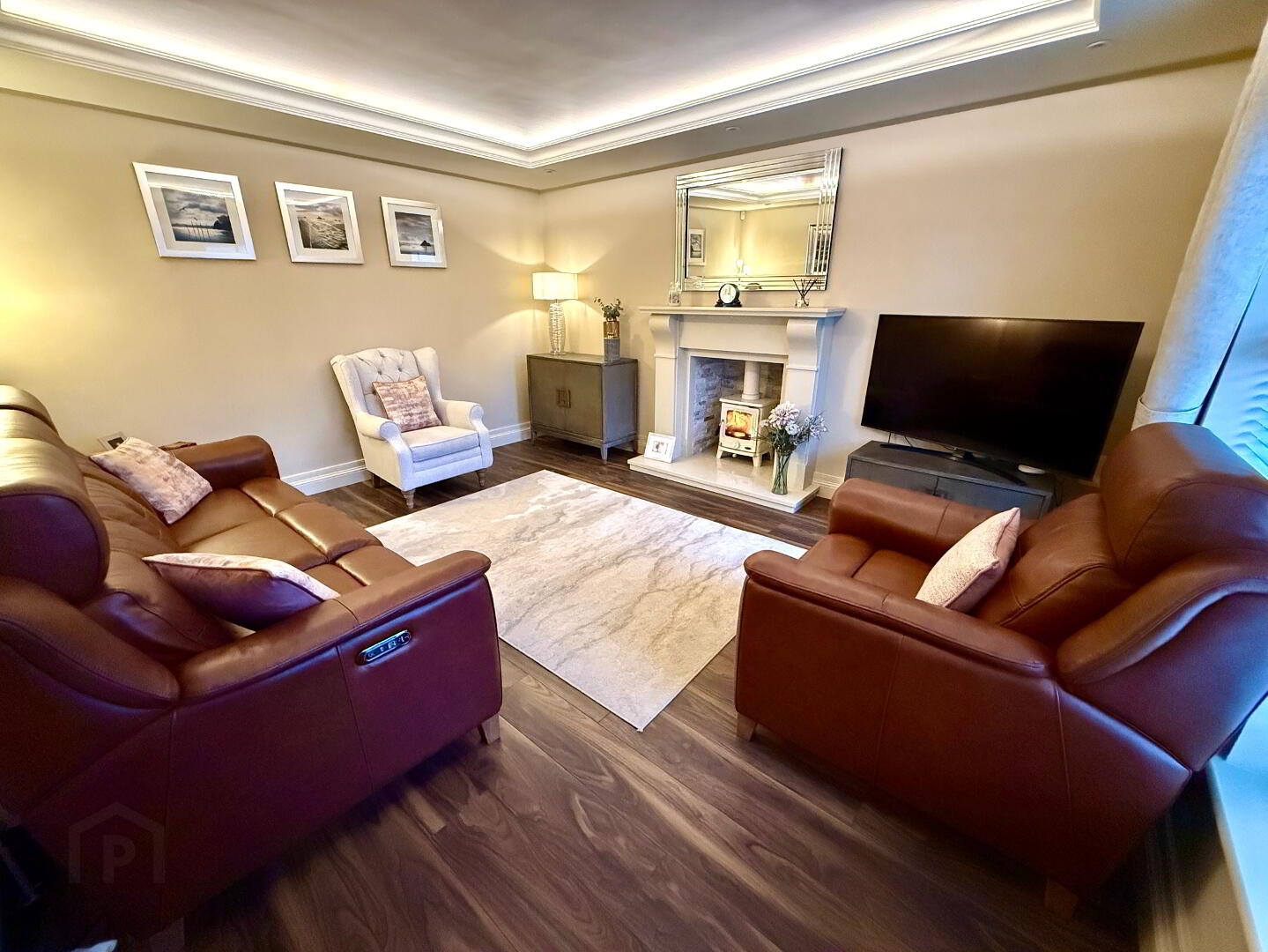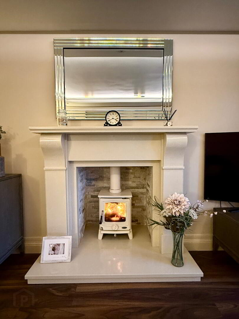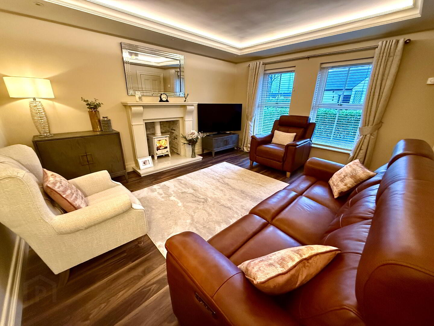 Lounge  14'10 x 12'11  Wood burning stove set in marble fireplace, laminated wooding floor, feature ceiling with recessed lighting and cove lighting.