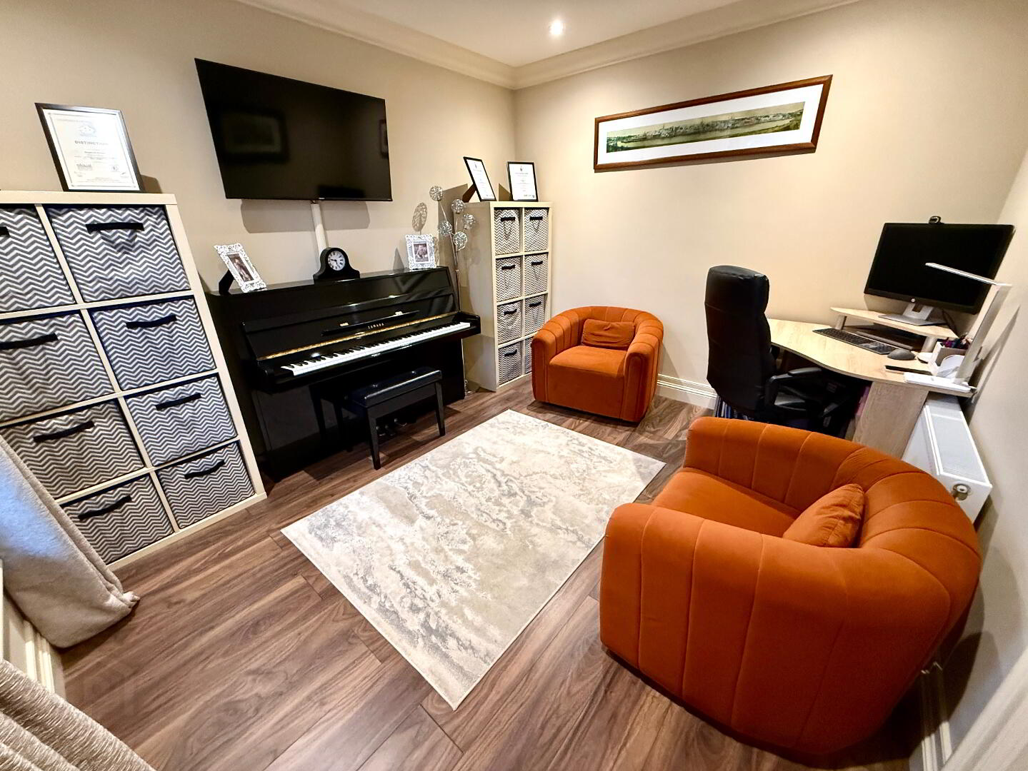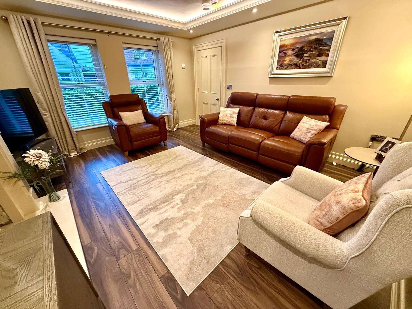 Family Room  11'3 x 9'10  Laminated wooden floor, ceiling cornicing and recessed lighting.