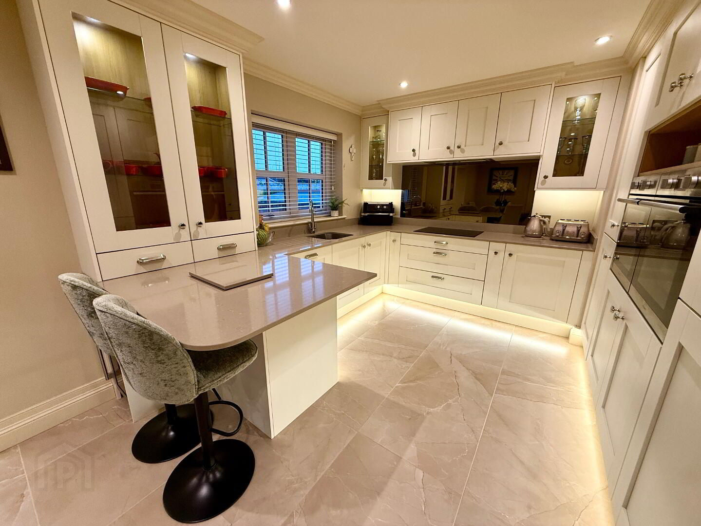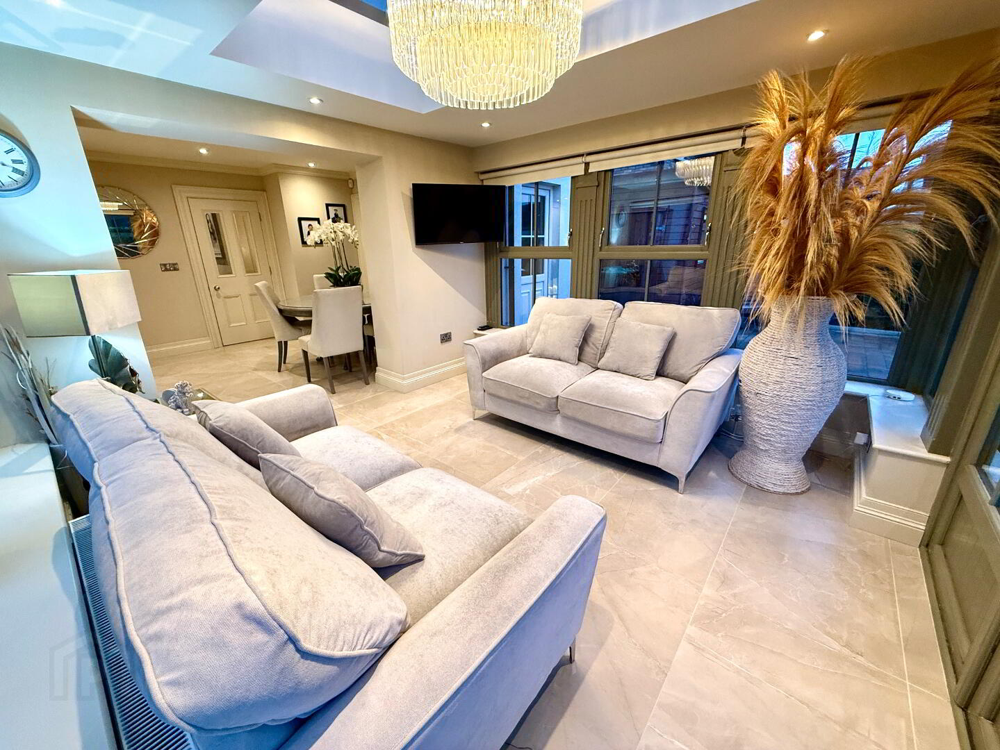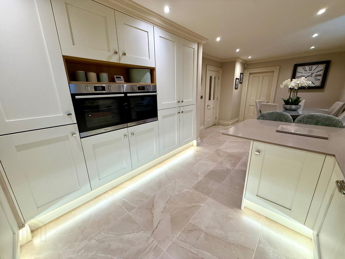 Open Plan Kitchen/Dining/Orangery  24'1 x 23'5  Eye and low level units, glazed display units, larder cupboard, stainless steel sink unit with mixer tap, hob, 2 wall ovens and extractor fan, integrated dishwasher, integrated fridge/freezer, ceiling cornicing, recessed lighting.
